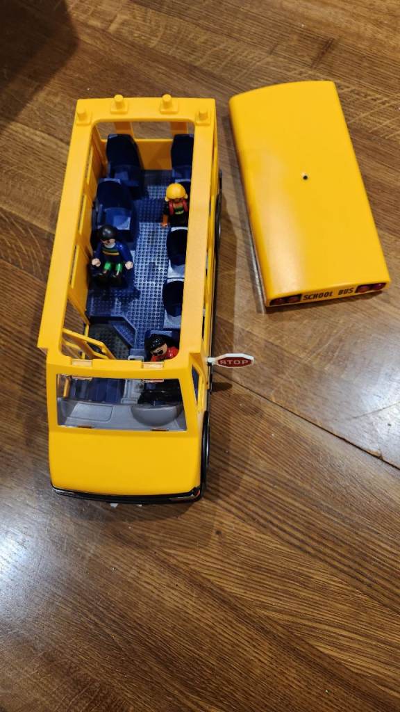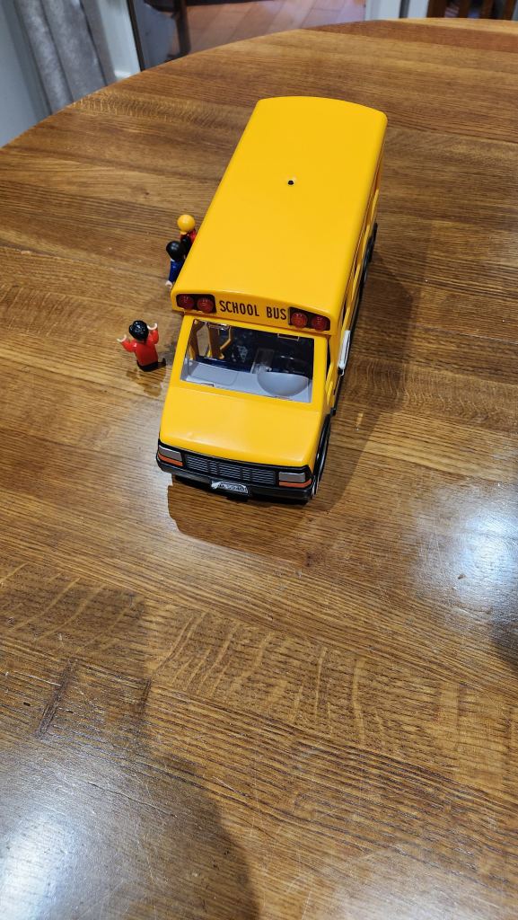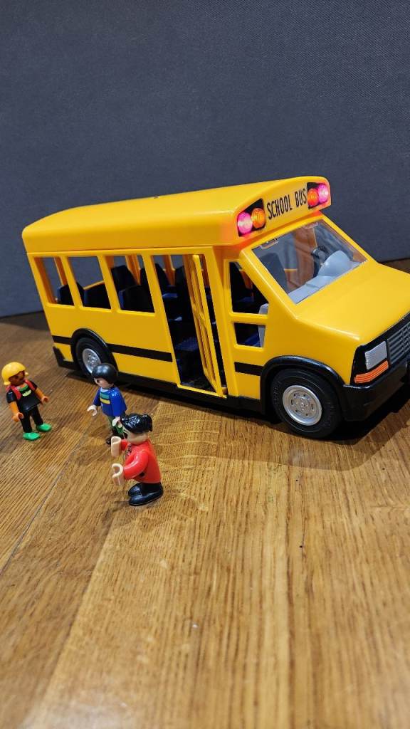 Yellow school bus with flashing lights front and back. Includes three figures. Door opens and closes at front.