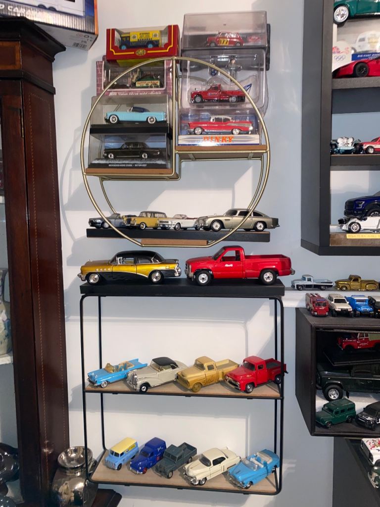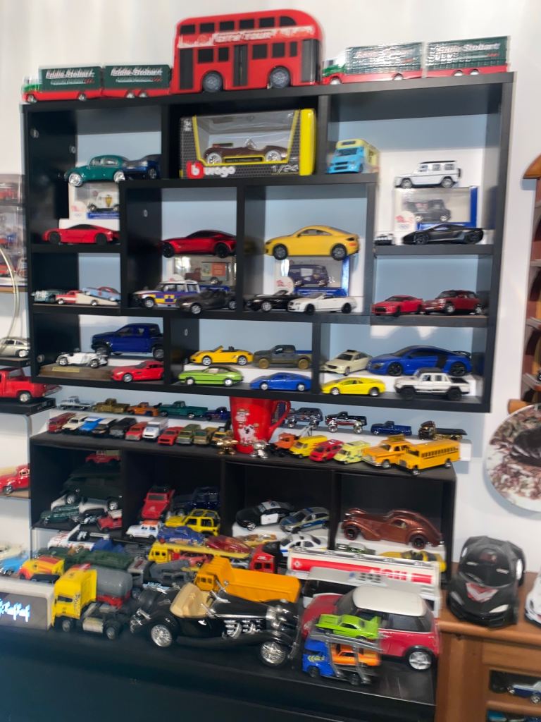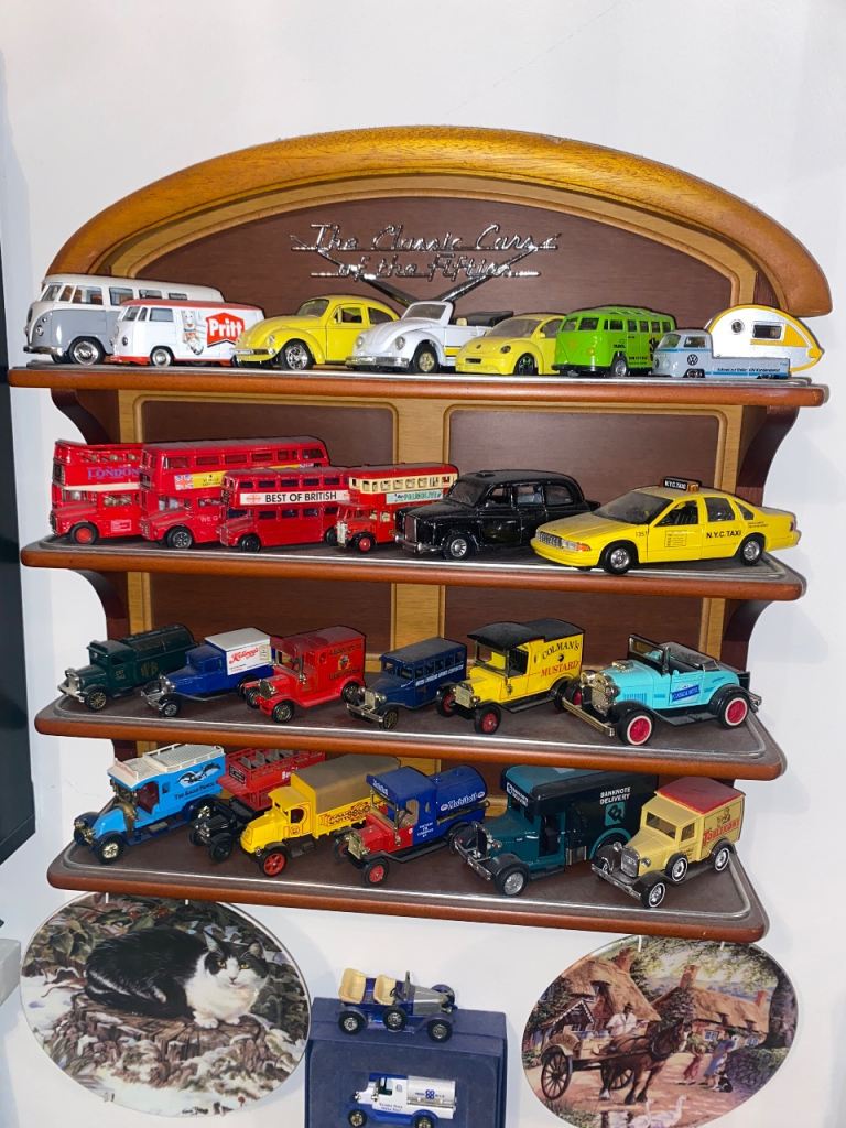 A selection of toy cars for sale, different sizes and different conditions. Some are brand new in original packaging.