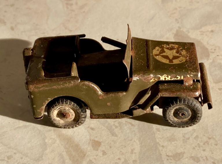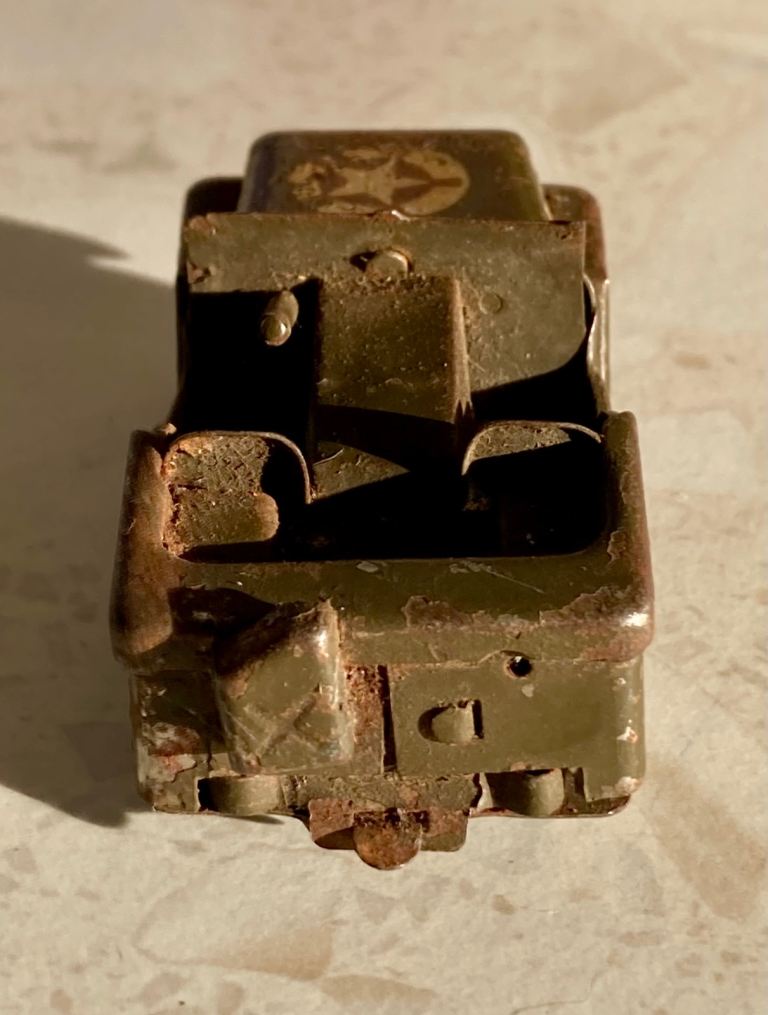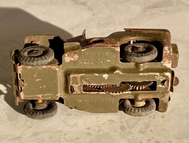 Vintage Triang Minic Toy Jeep; ‘clockwork model’ no key. (c1940/50’s) played with condition, with all tyres.
