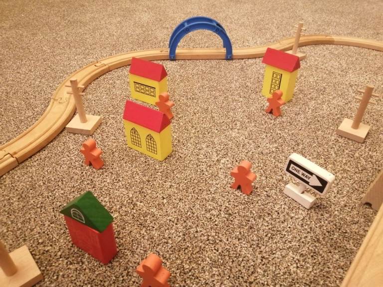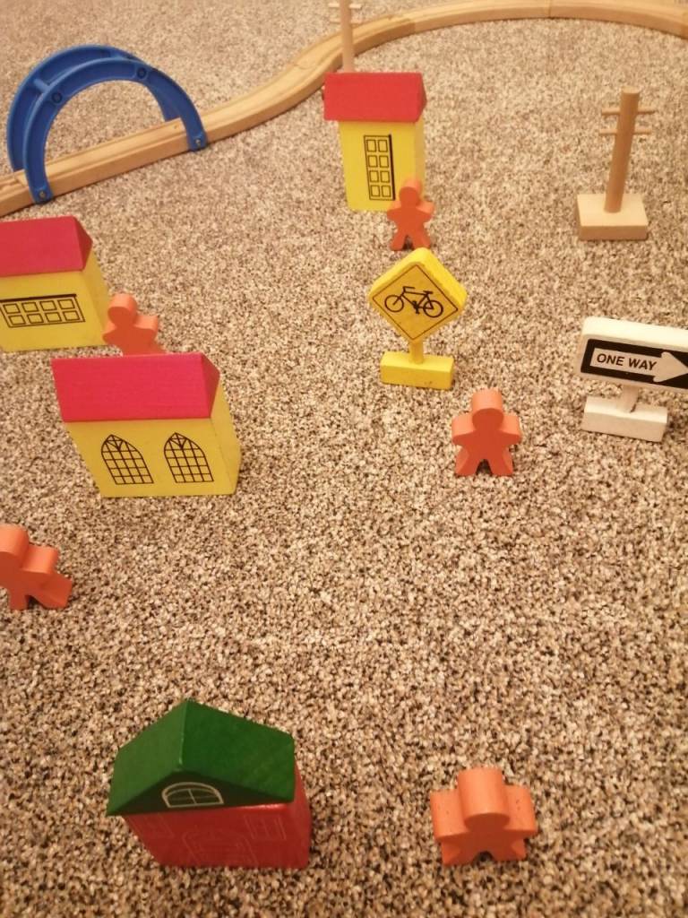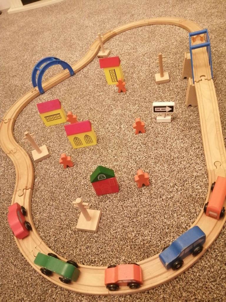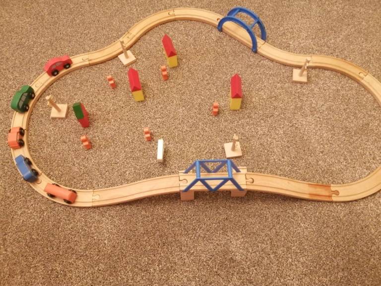 Available 42 piece wooden set, 16 curved tracks, 2 straight bridges with base blocks, cars, people etc as shown in pics hardly used, £15 cash on collection please from Amesbury