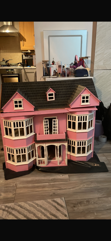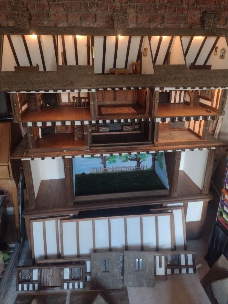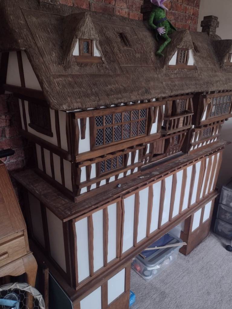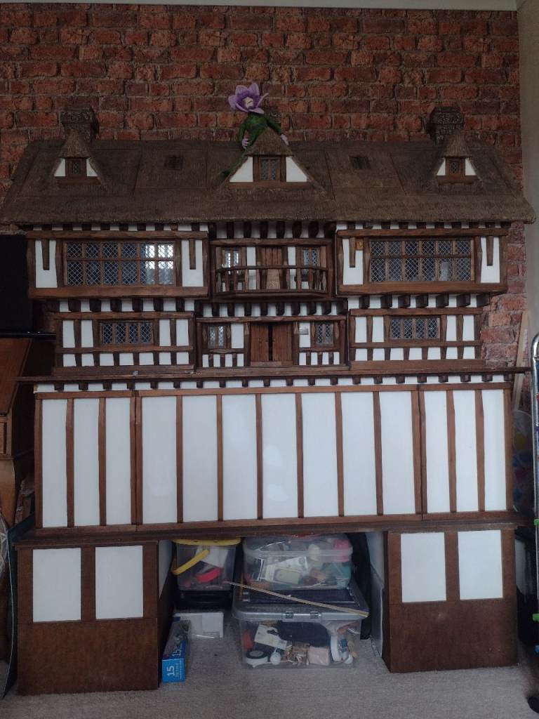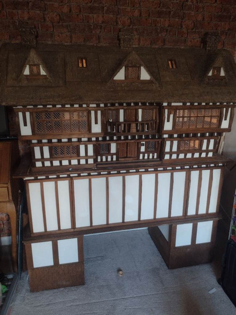 Huge Robert Stubbs 5 foot wide x nearly 6 foot tall Tudor dolls house the top section comes off the middle section then the 2 boxes it stands on come separately. I collected it in 2 trips in my Nissan xtrail so will fit in a small van.