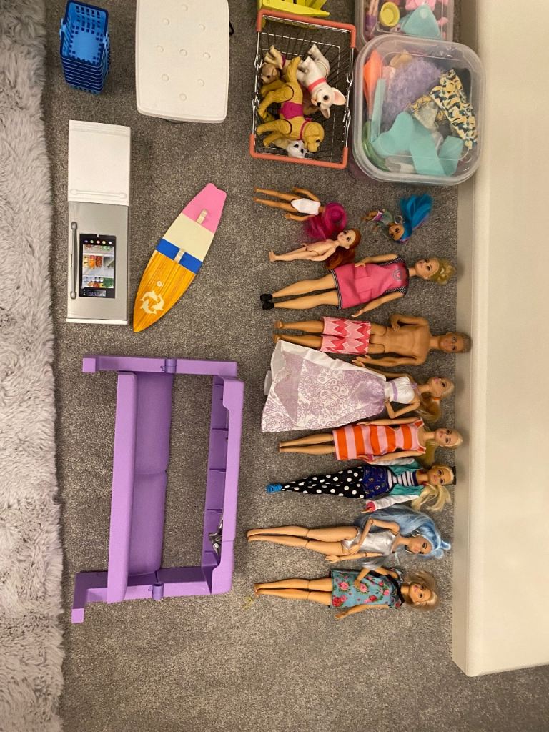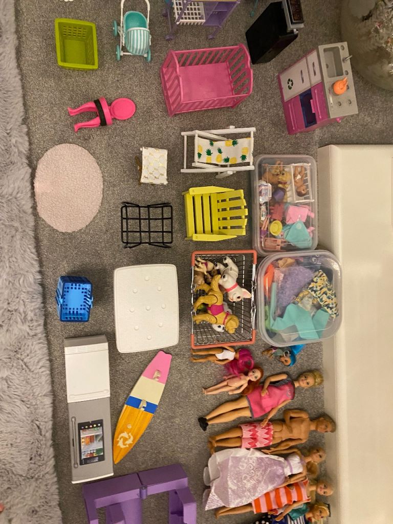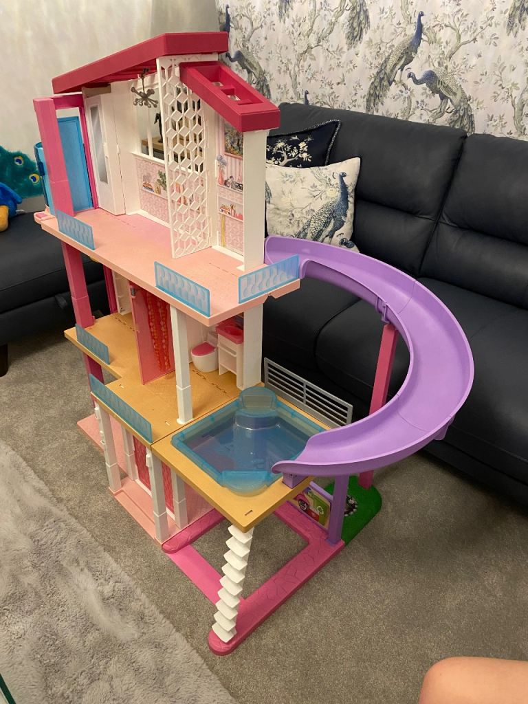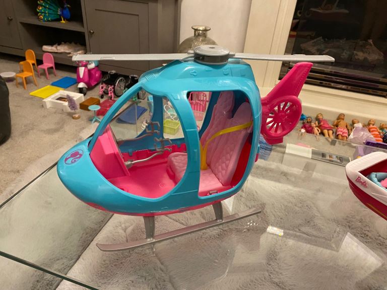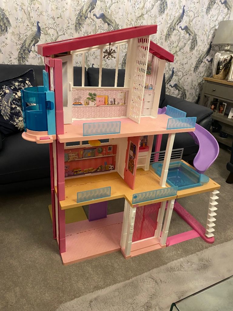 Barbie Dreamhouse in excellent condition, including furniture, helicopter, speedboat, scooter, 6x Barbie dolls, 1x Ken, 2x giant Barbie’s, clothes, drum kit, pet dogs and much more