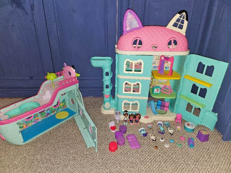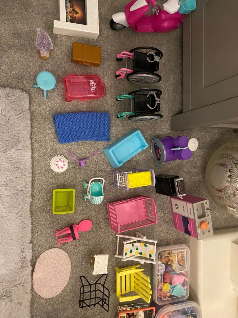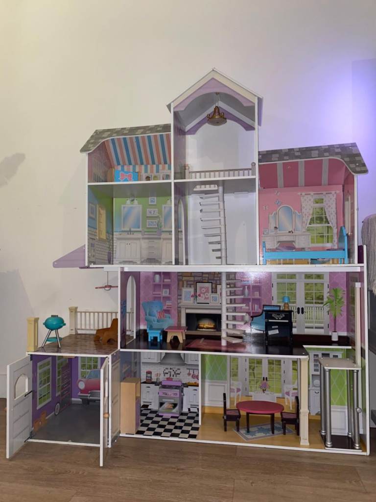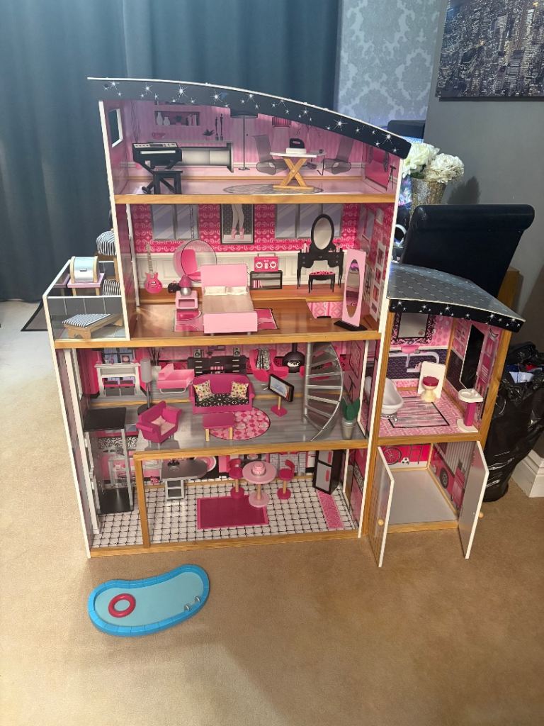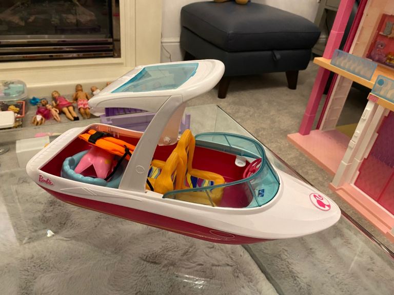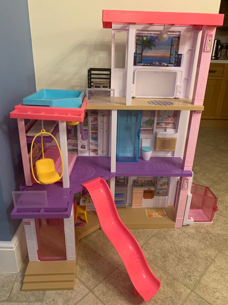Barbie Dreamhouse in excellent condition, including furniture, helicopter, speedboat, scooter, 6x Barbie dolls, 1x Ken, 2x giant Barbie’s, clothes, drum kit, pet dogs and much more