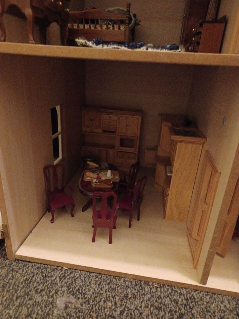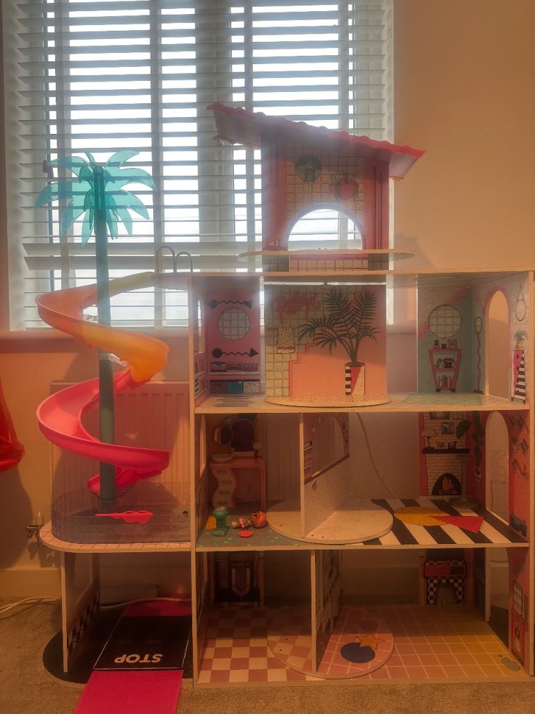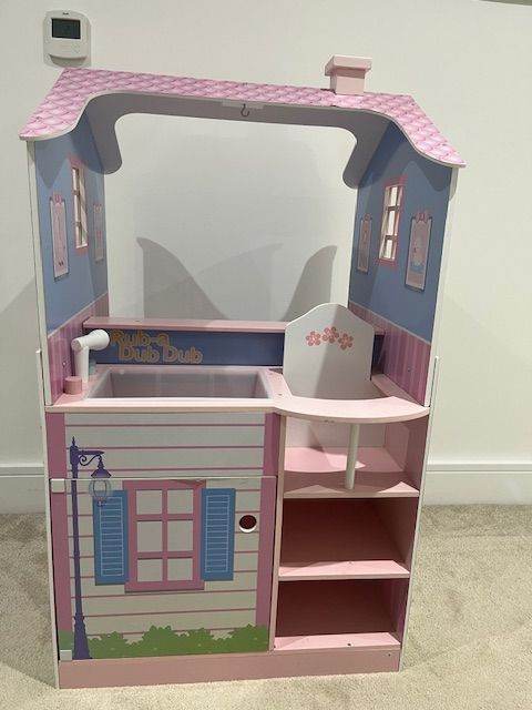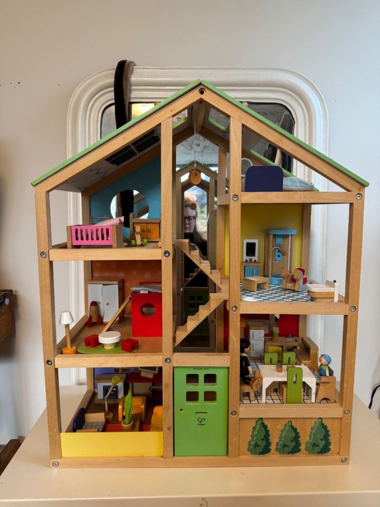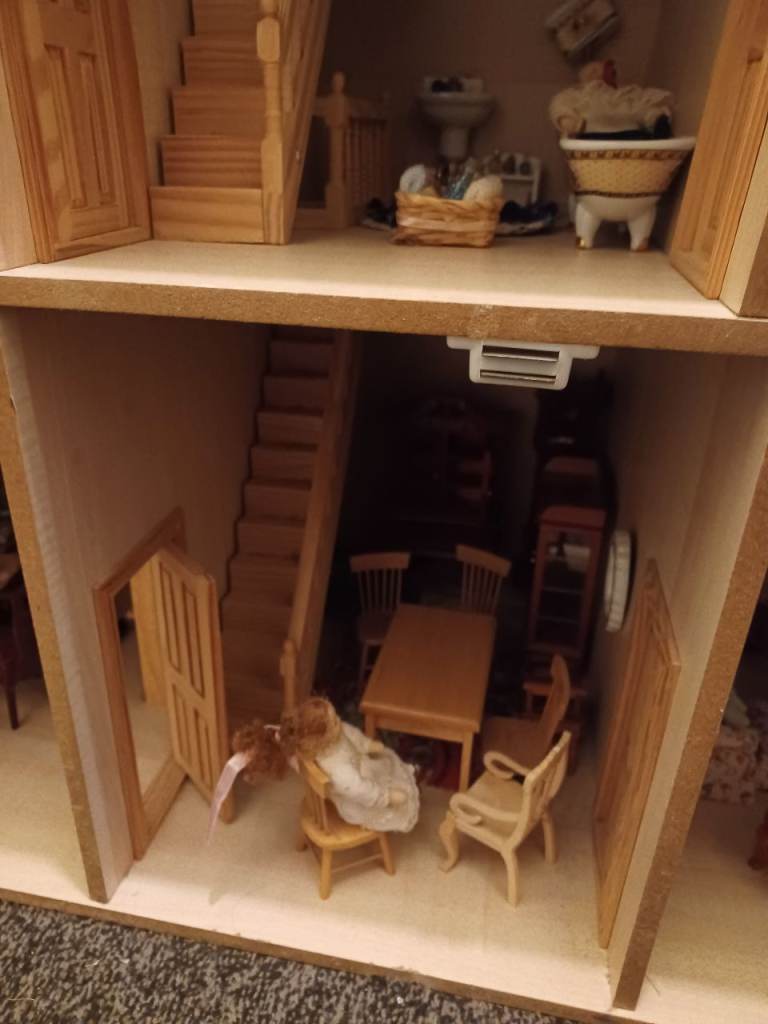 American-style 1920s-30s dolls house with 3 floors (loft, first floor and ground floor), furniture, and 11 dolls (grand/parents, children and baby). Roof and doors are detachable and have come off but could be attached. There are lights and chimneys which could be attached. There is also carpets (from our own house) for a few rooms which I can give with the house if wanted. It's been well-played with, however, still plenty of life left. Recommend a viewing. Needs a car to transport it.