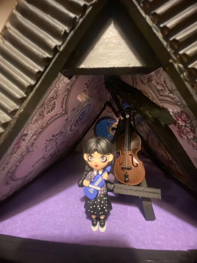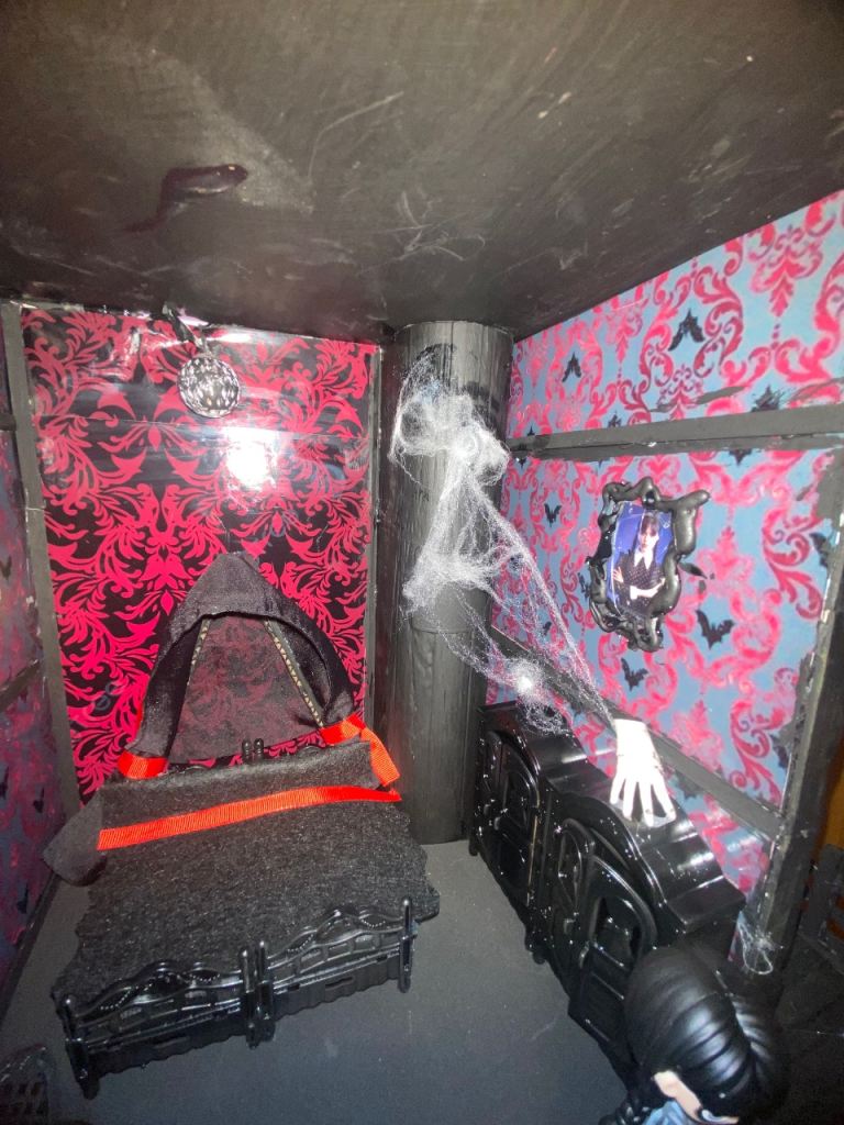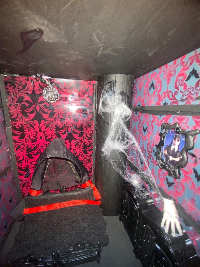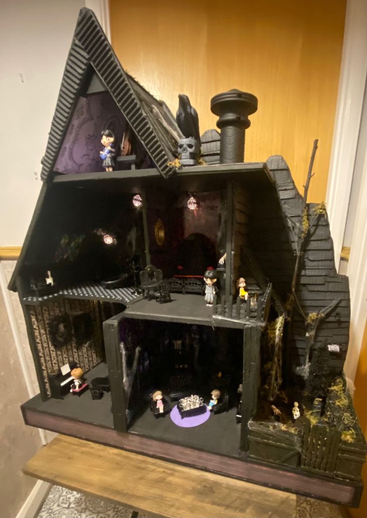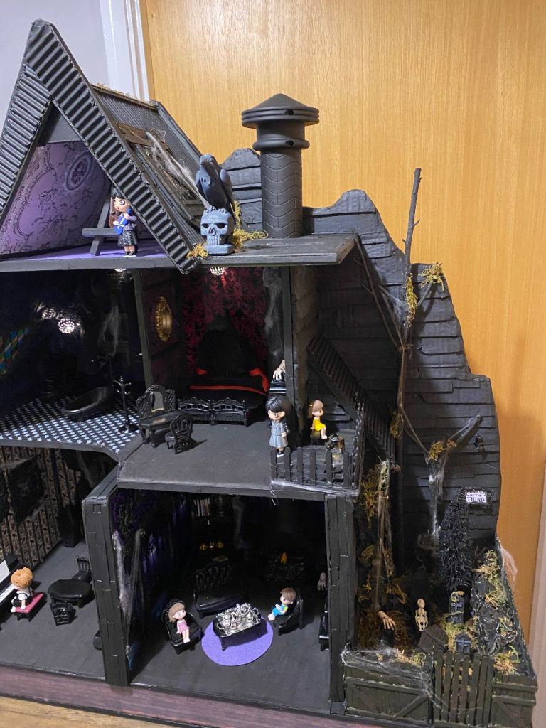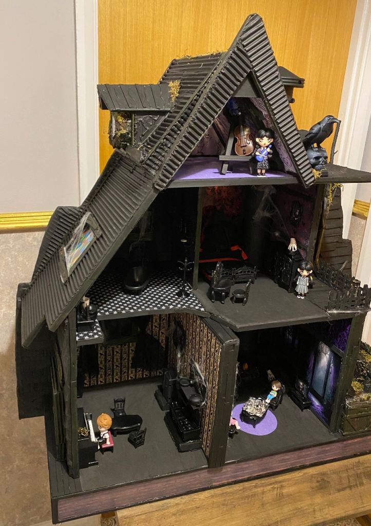 A striking, fully handmade Wednesday Addams–inspired gothic dollhouse, built as a unique one‑off piece.