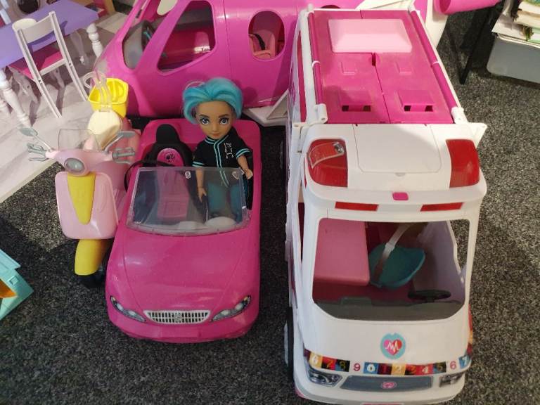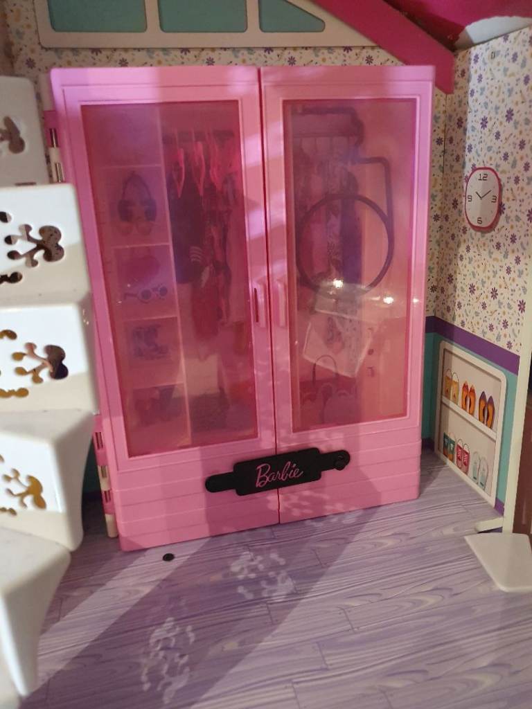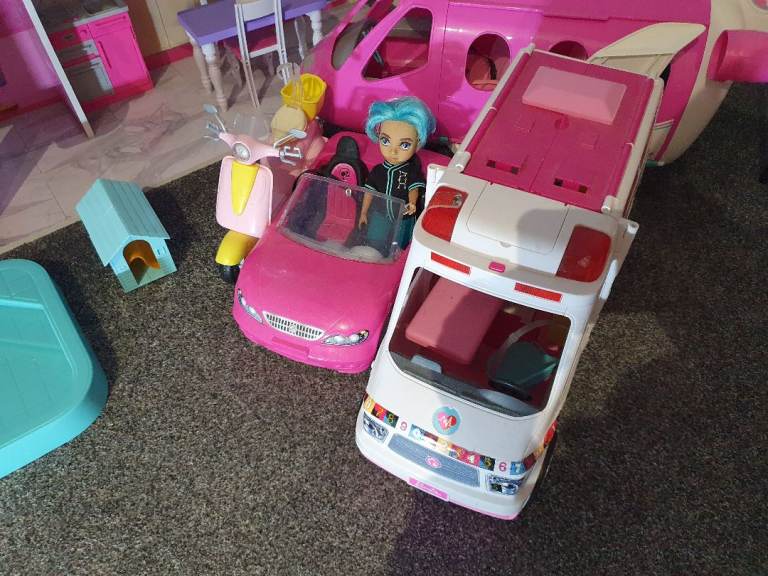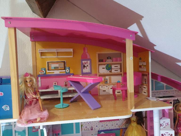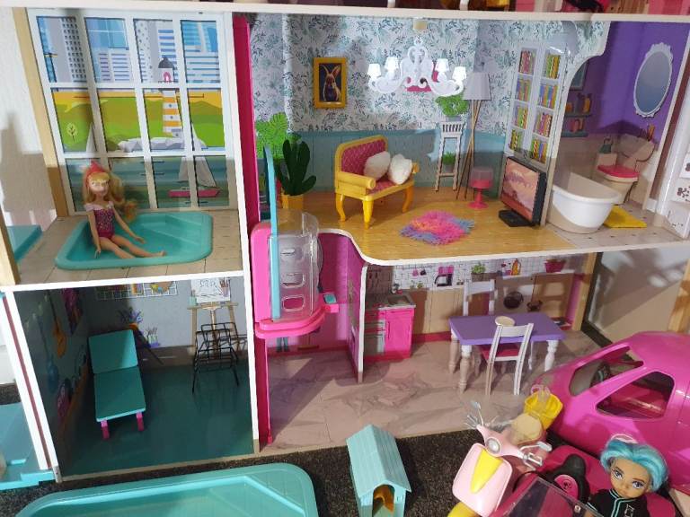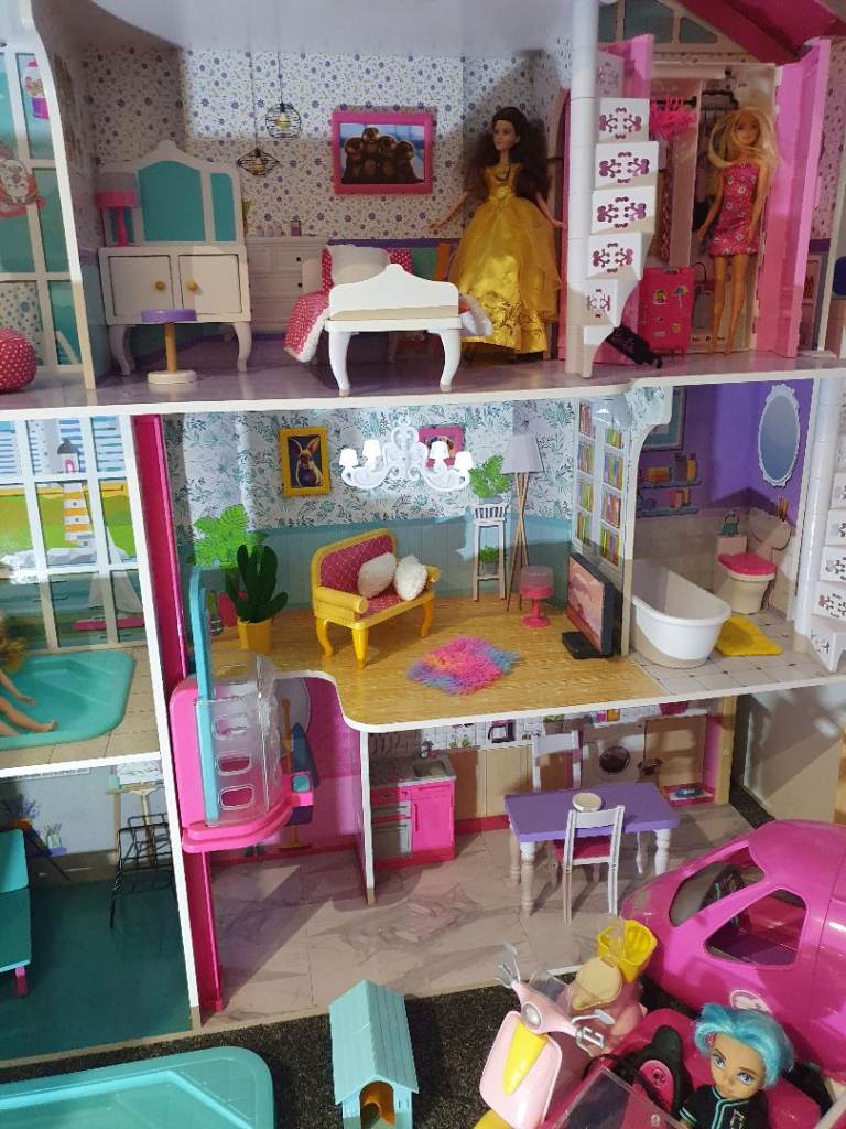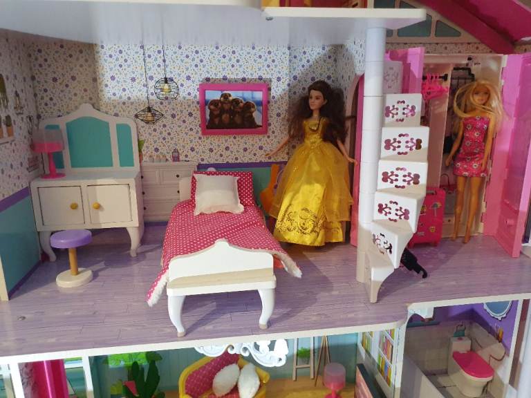 My Daughters Amazing! Dolls house! Hardly played with, spotless!+ Barbie plane, car, ambulance , moped, Dolls, wardrobe ,accessories. Working lights, toilet,door bell. All cost over £300! 4ft high & wide. Absolute bargin! £55! Big car or van needed!