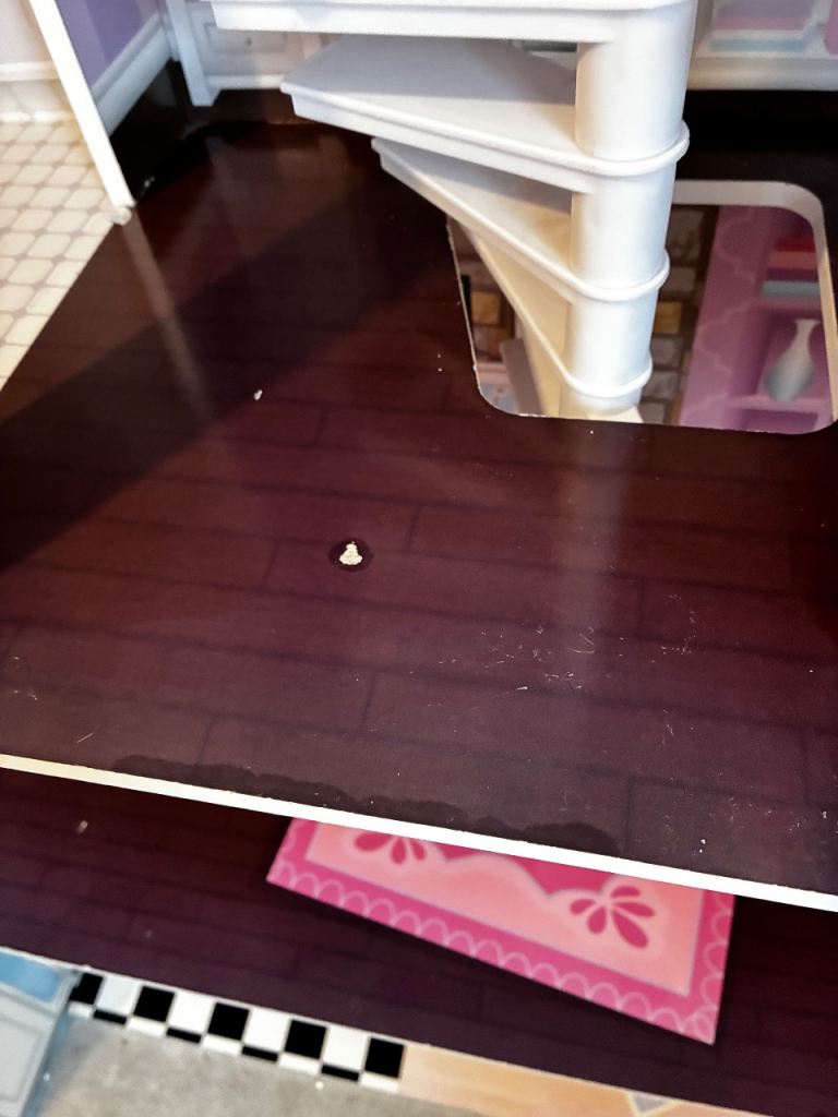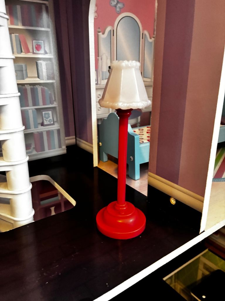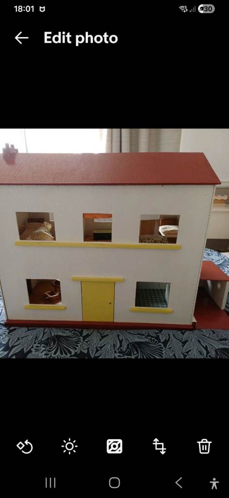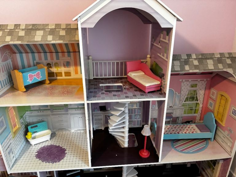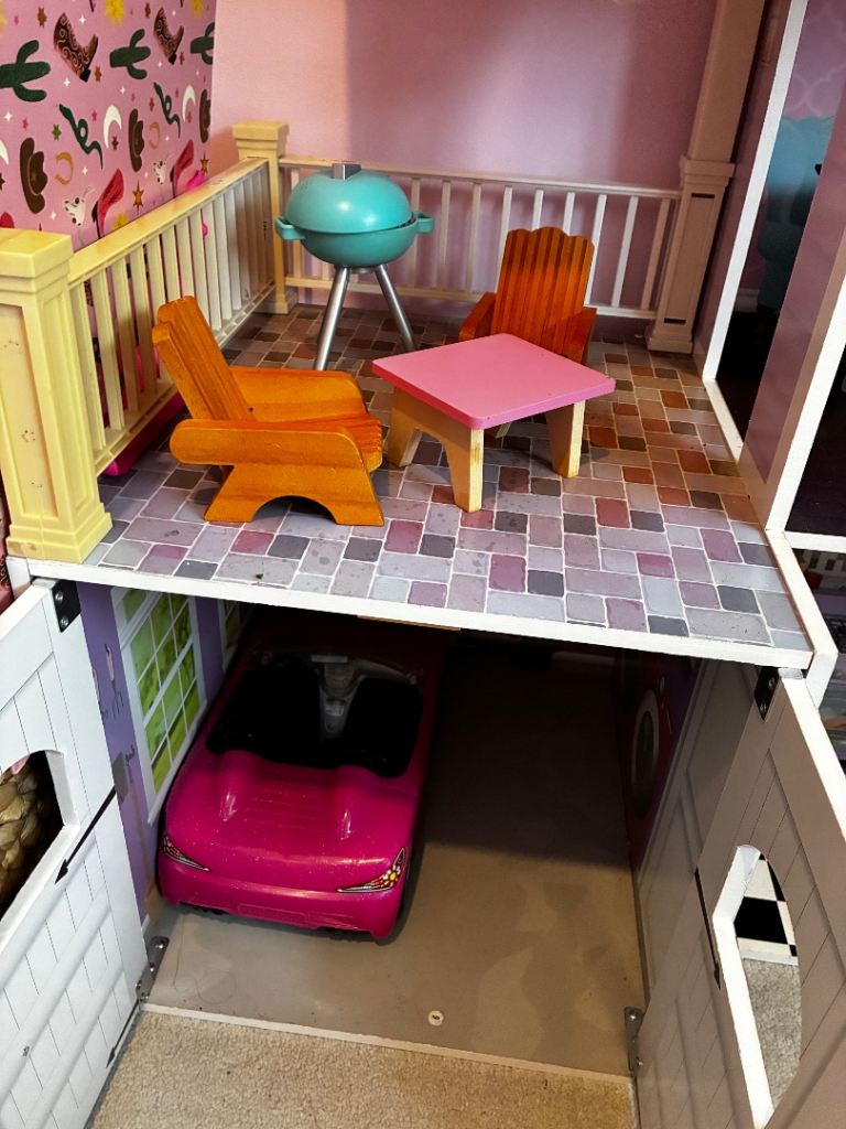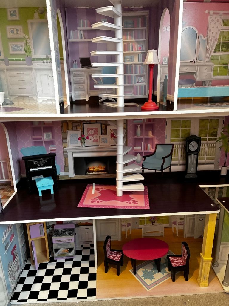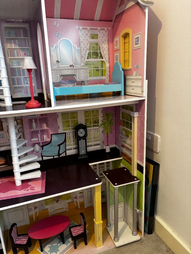 Large wooden dolls house with moving lift and garage. The furniture shown is included.