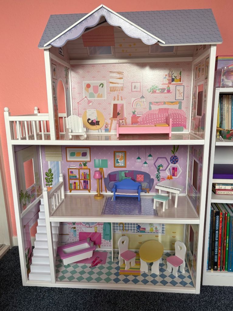 Made from real sustainable wood, this house measures 4 feet tall by 4 feet wide featuring 4 stories and 9 play areas including a fully equipped kitchen, pool, rooftop patio, diner, and more!