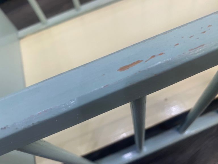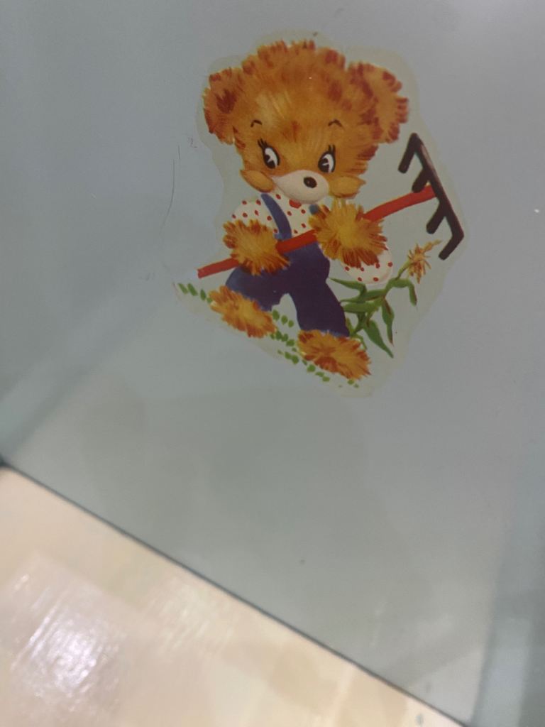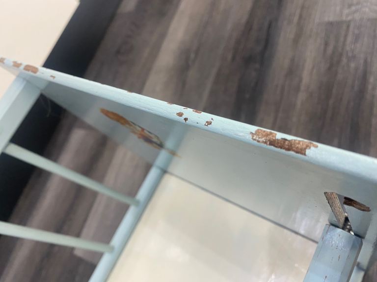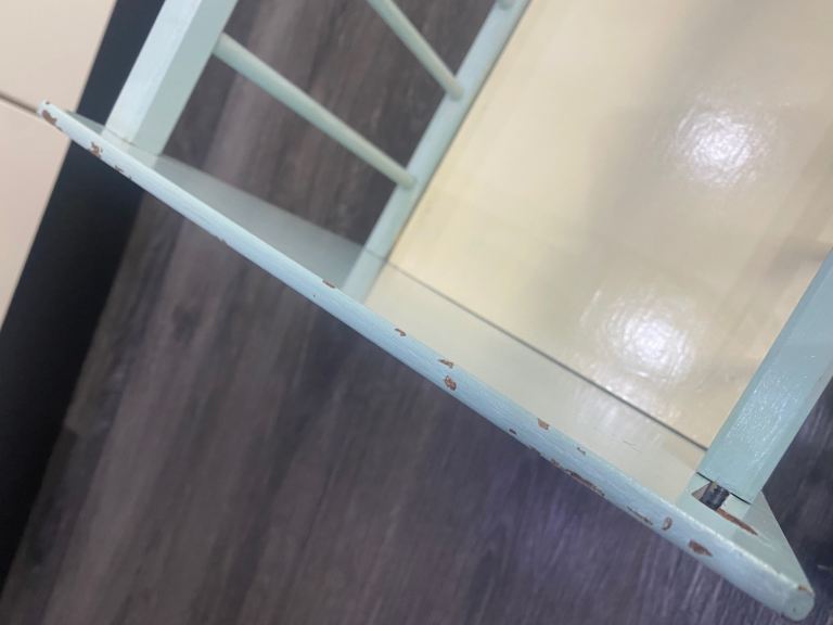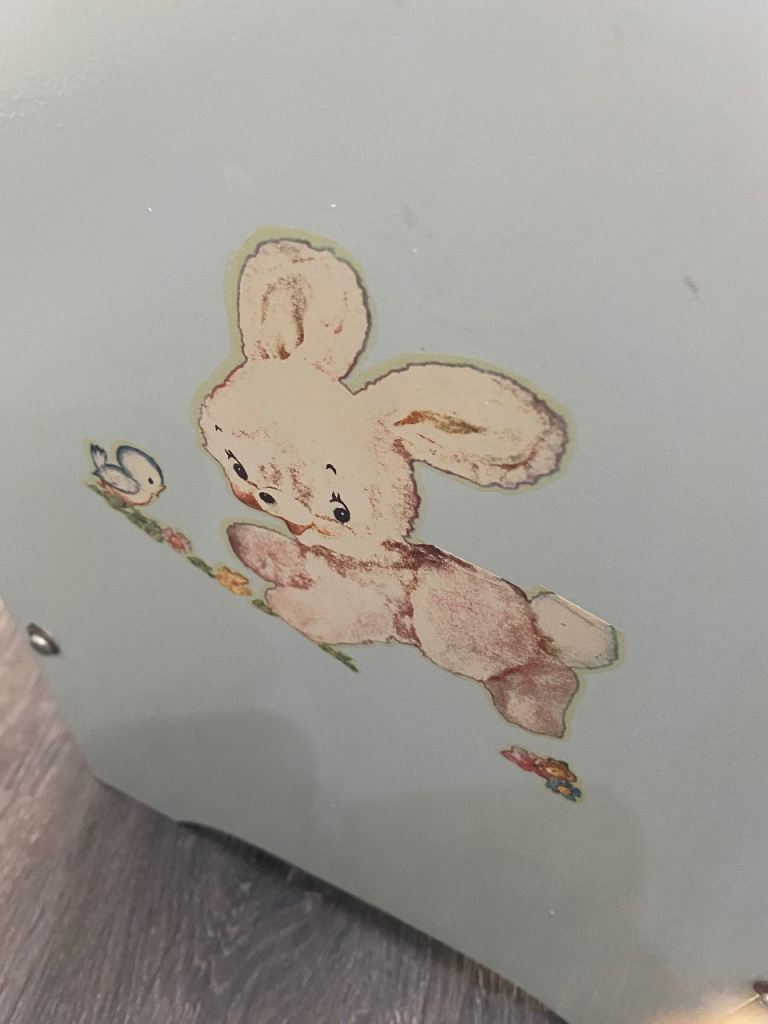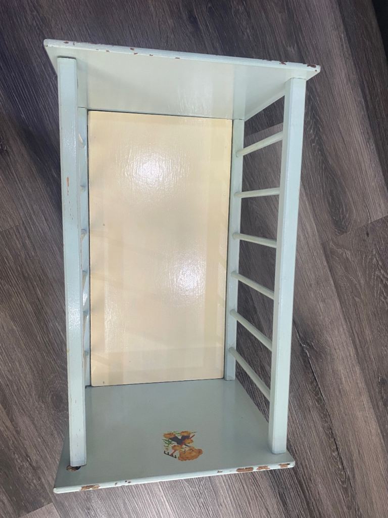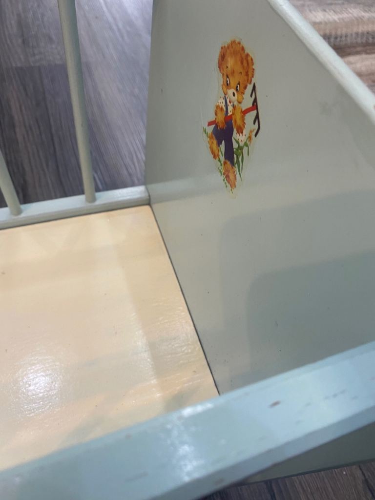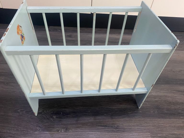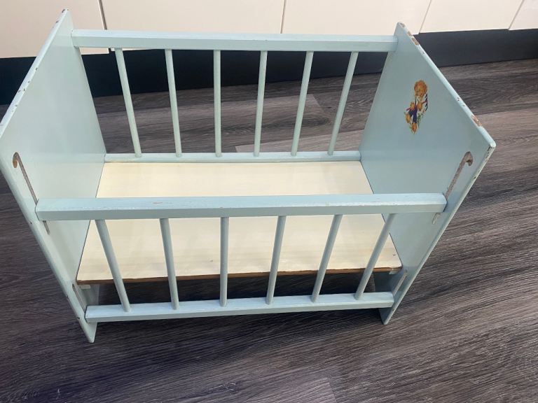 Lovely vintage toy cot, pale blue with 2 images/ transfers, obvious signs of wear & tear, one side slides down