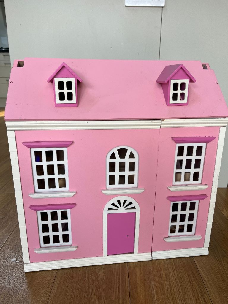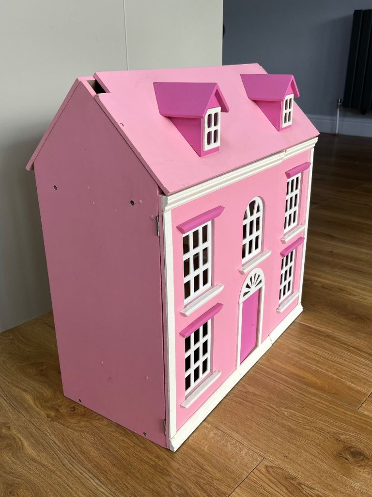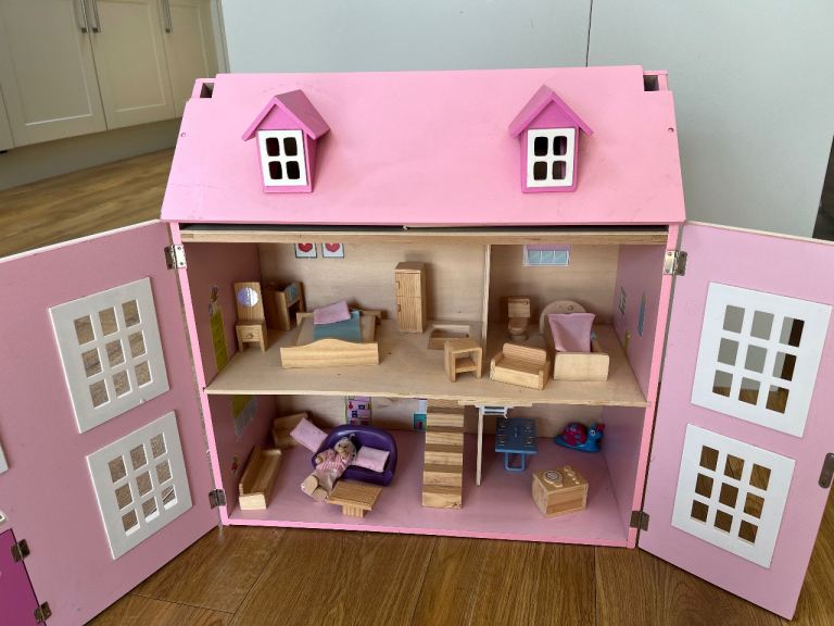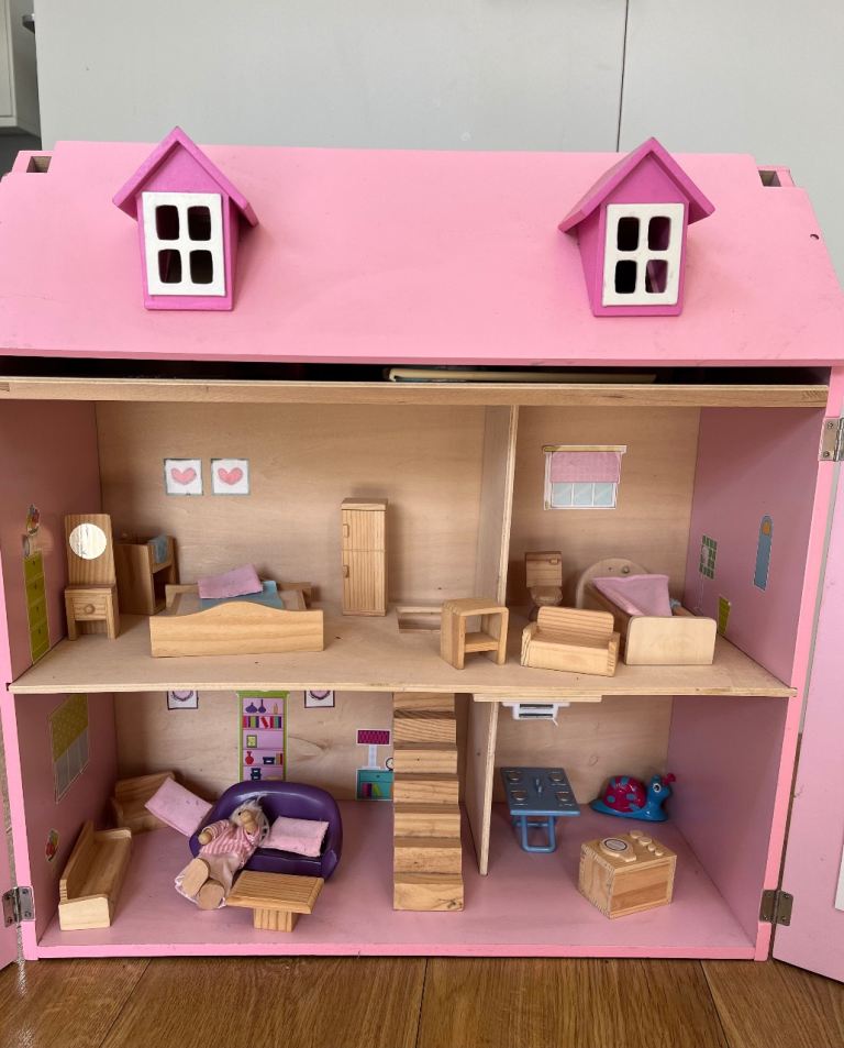 Wooden dolls’ house for sale, complete with furniture. In good overall condition with some signs of use. Great for imaginative play.