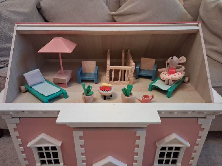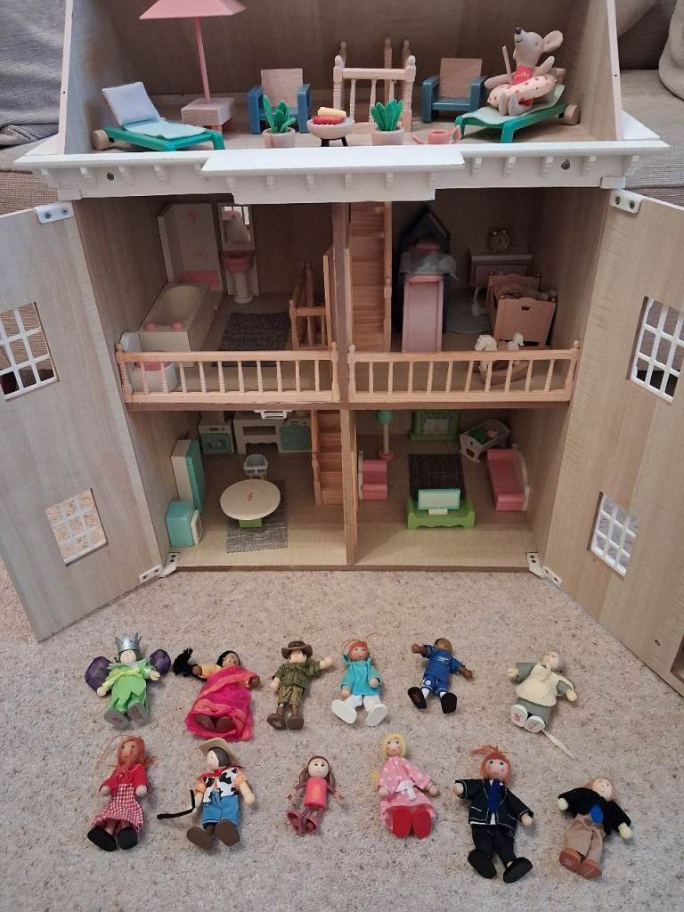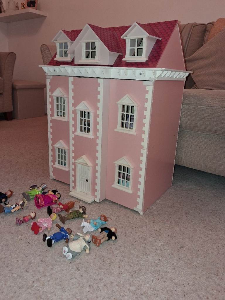 Wooden dolls house in pink, includes plenty of furniture and dolls. Plus some extra dolls not pictured.