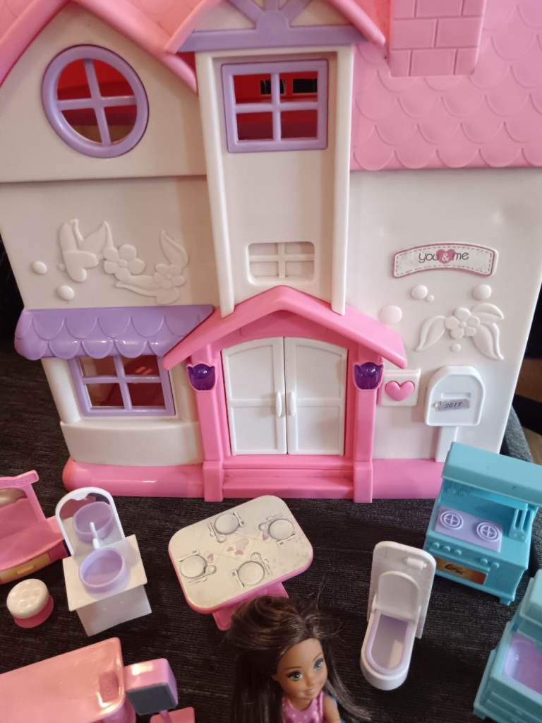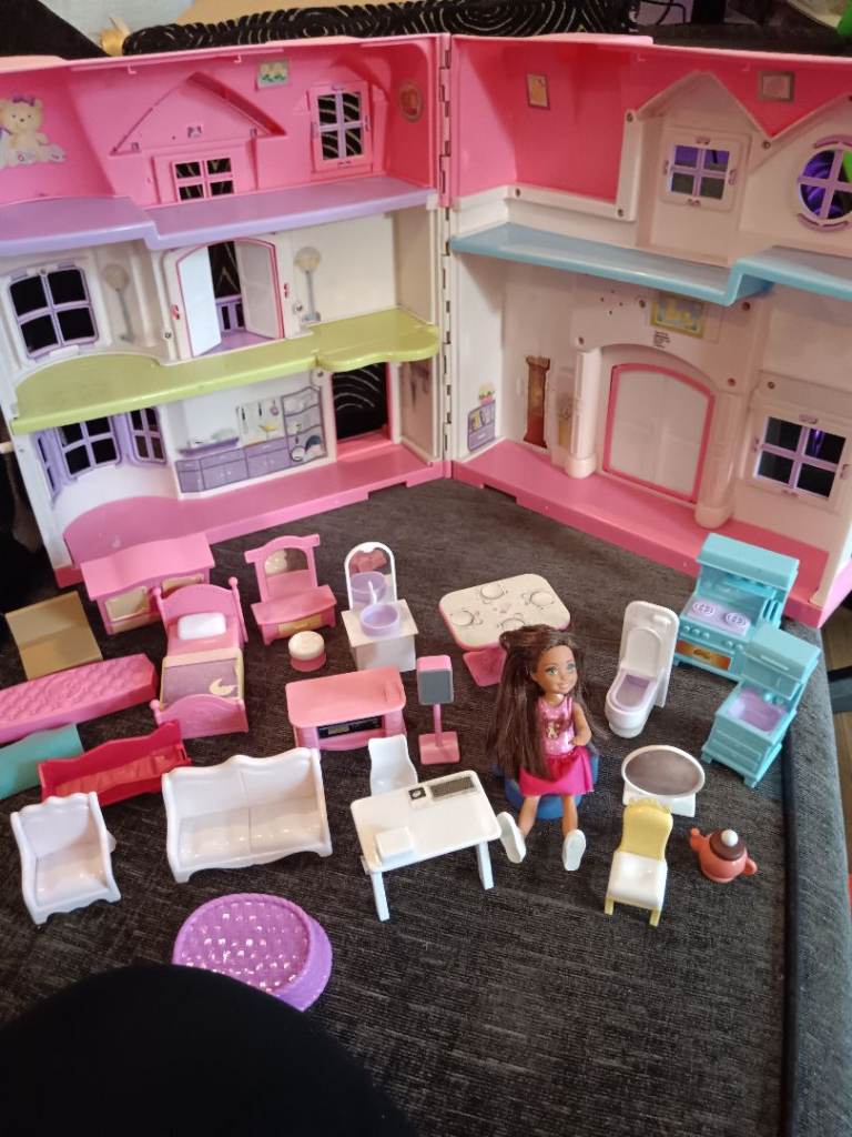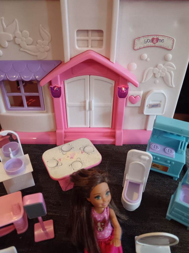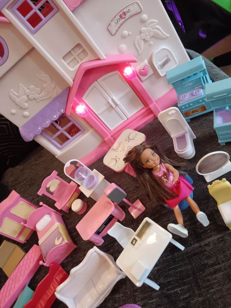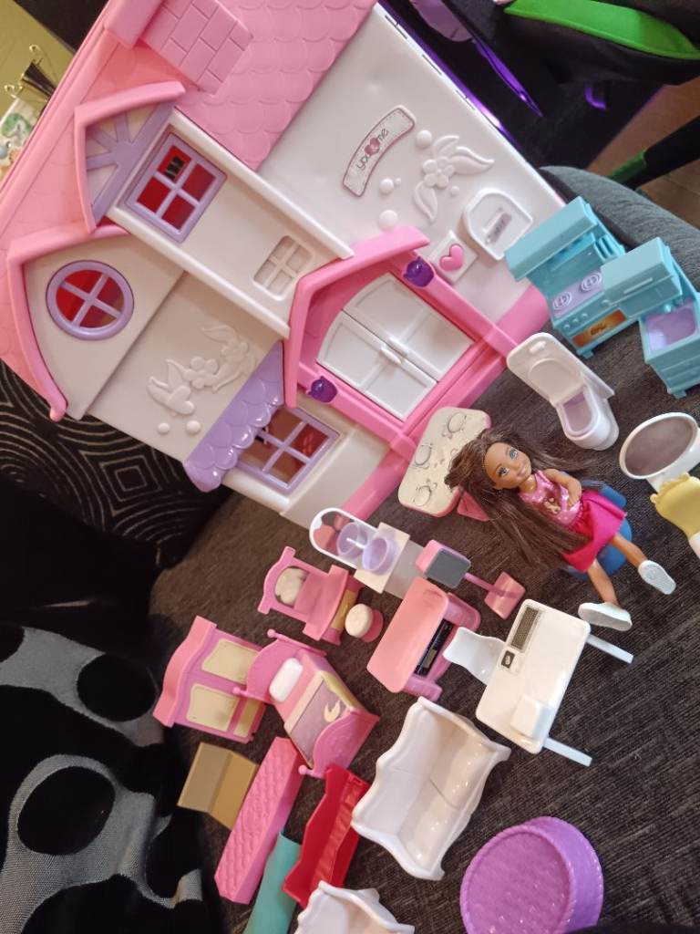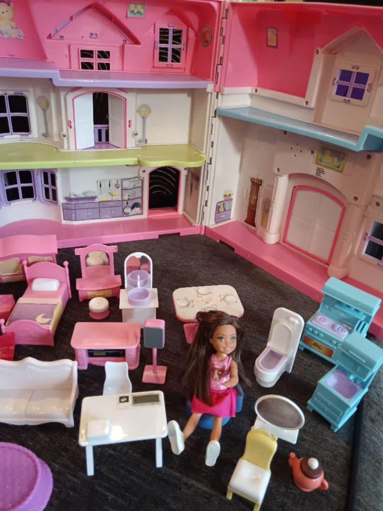 Lovely dollhouse set in good condition, complete with various pieces of furniture.