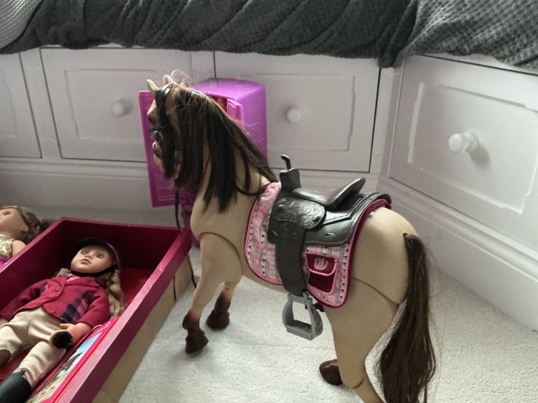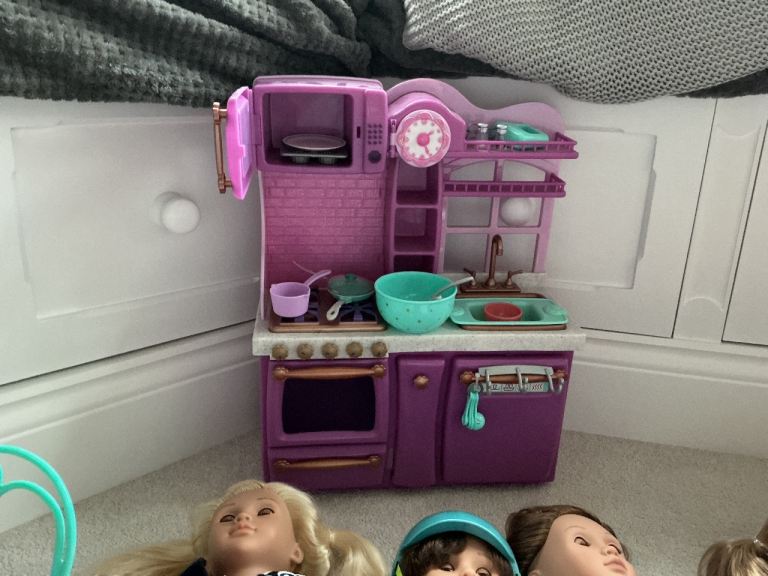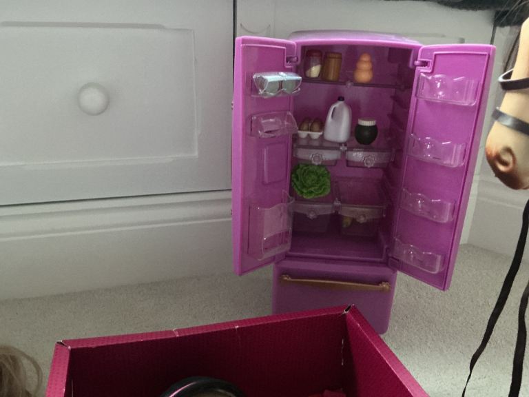 Full fridge and kitchen, dining table with chairs and accessories, and horse and rider still in packaging. Brand new doctors outfit, still in packaging and 6 dolls altogether - including the horse rider. Dog ball and plants too.