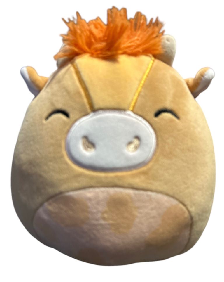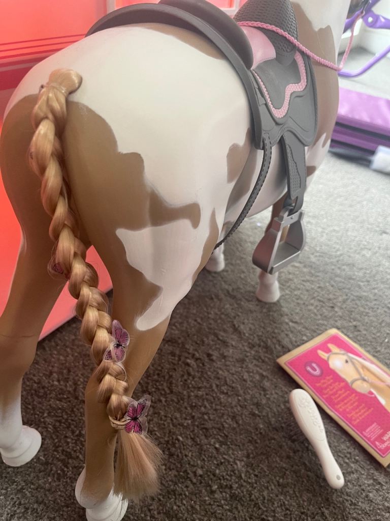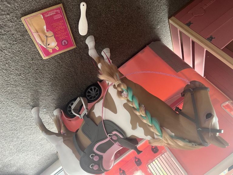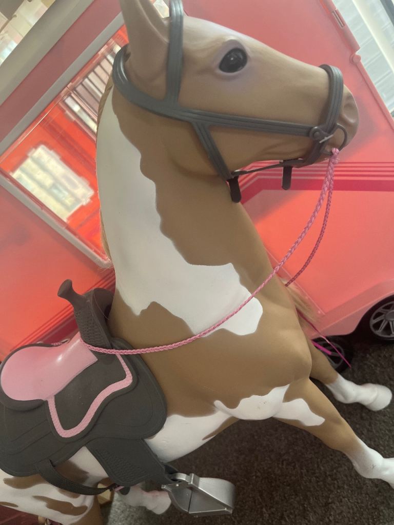Lovely large toy horse with a pink saddle and bridle, ready for adventures.