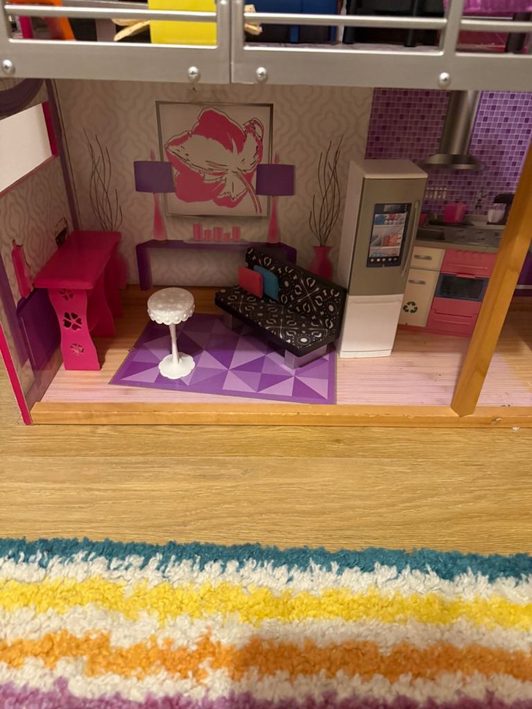 Three story retro Barbie house including retro furniture for sale. Excellent condition and from smoke free house.