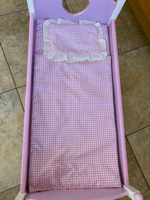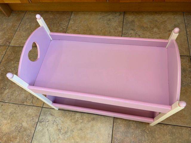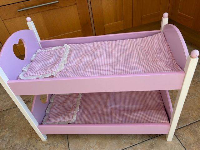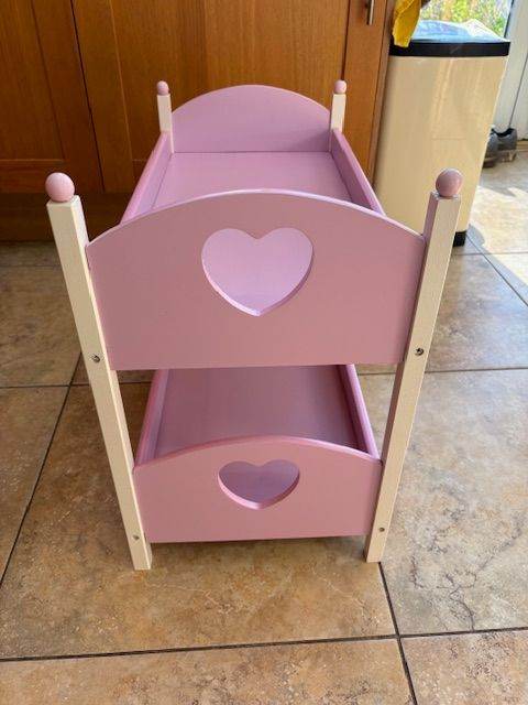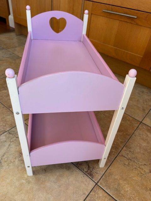 Toy doll wooden bunk beds - pink and white. Bought from Smyths and kept at grandparent`s house so only used occasionally - excellent condition. Comes with pink and white bedding. Measures: full length 56cm and inside bunk bed is 53cm. Total width is 29cm and inside bunk bed is 27cm. Height to top of pink round ball is 47cm. Would suit a toy doll up to 50cm long. Dolls are not included. Collection from Tattenham Corner, Epsom Downs. Could deliver if nearby in Epsom area.