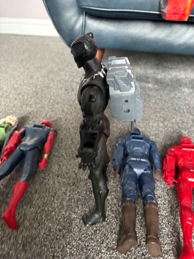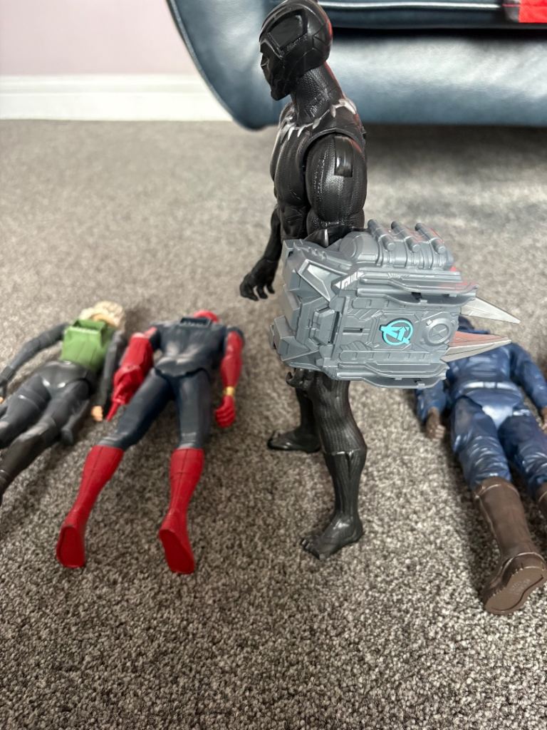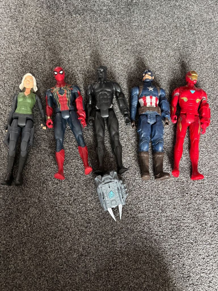 Black Widow, Spiderman, Captain America, Iron Man and Black panther. Includes 1 fx pack which slots in the back or on the arm of the characters. Set has hardly been played with. Excellent condition. Smoke and pet free home