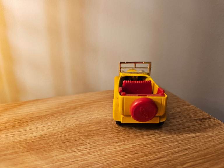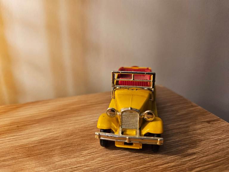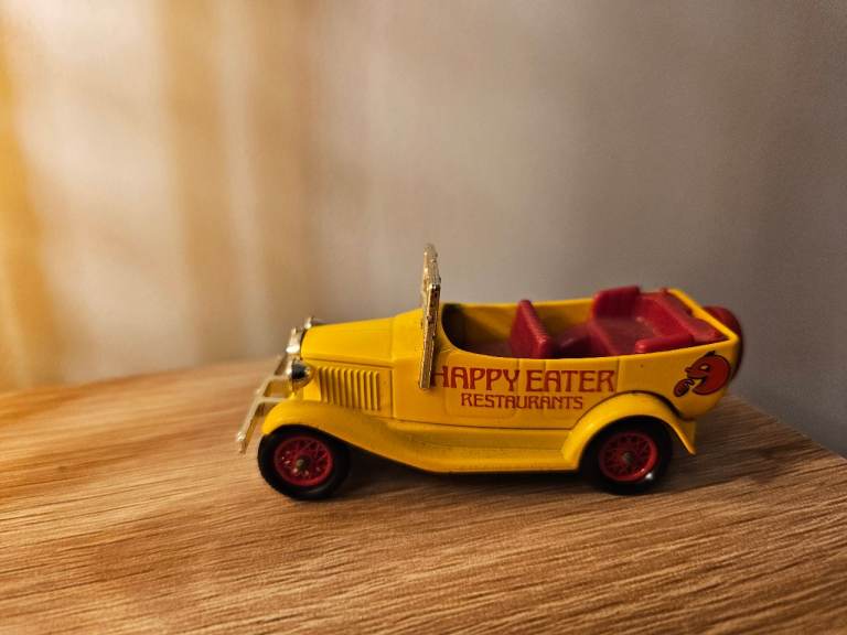 Collectible metal model of a vintage advertising car from Lledo, the Happy Eater Restaurants promotional version. A classic open-top car in the style of the early 20th century with a bright yellow body, red seats and detailed elements.
