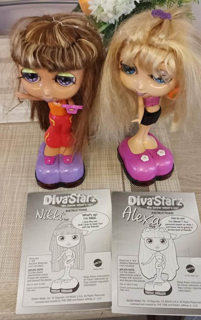 Two talking diva stars dolls, Nikki and Alexa, booklets included. Come with clip on clothes and will talk to each other when programmed.