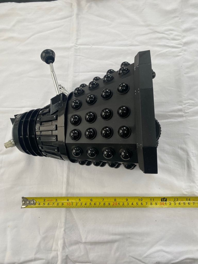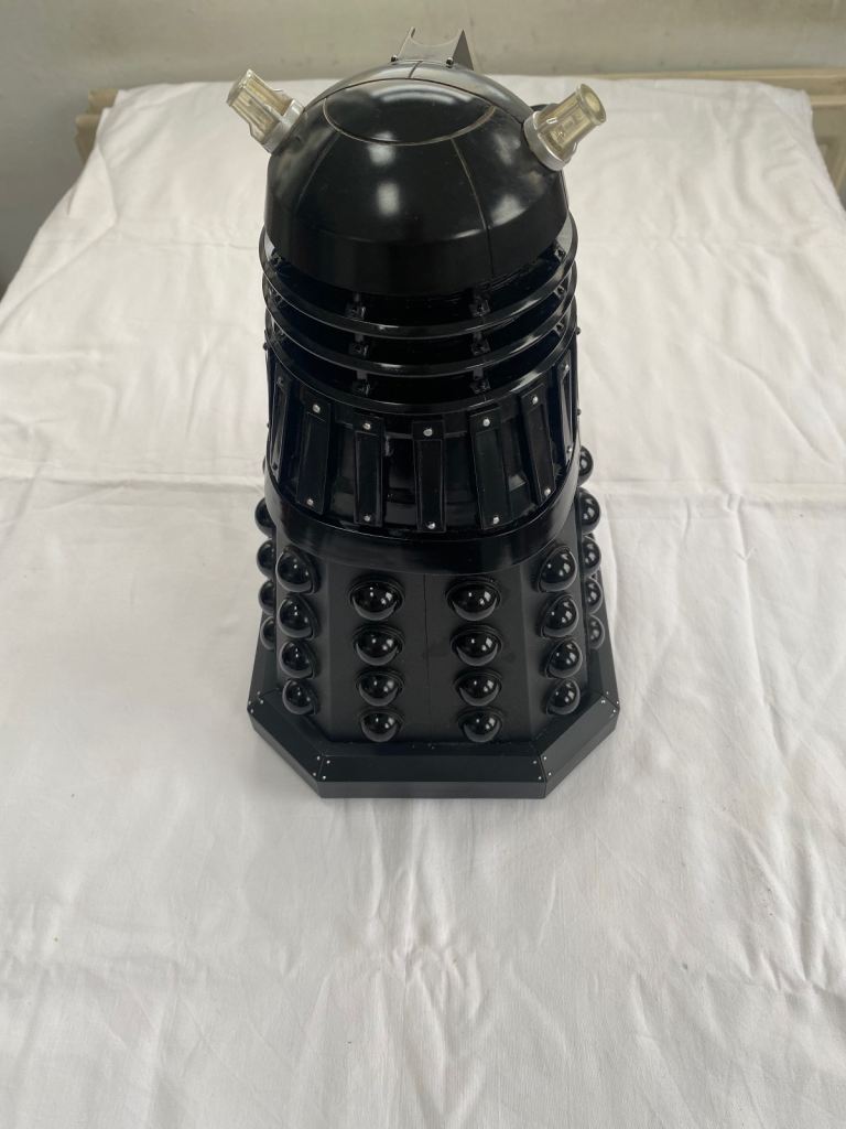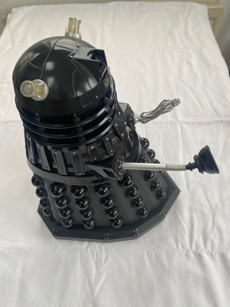 Doctor Who Black Dalek in played with condition. Stands 30cm. The eye stalk has become detached and needs gluing back on.
