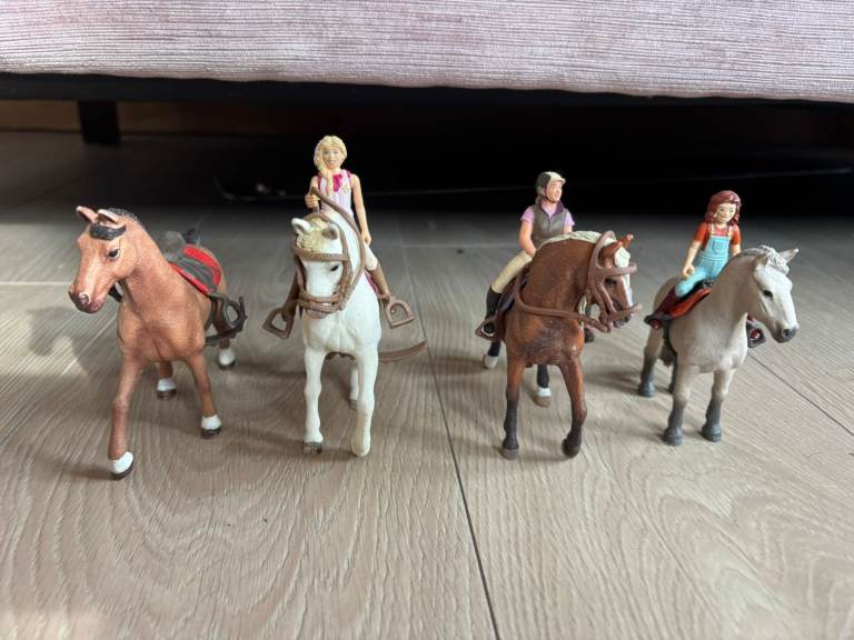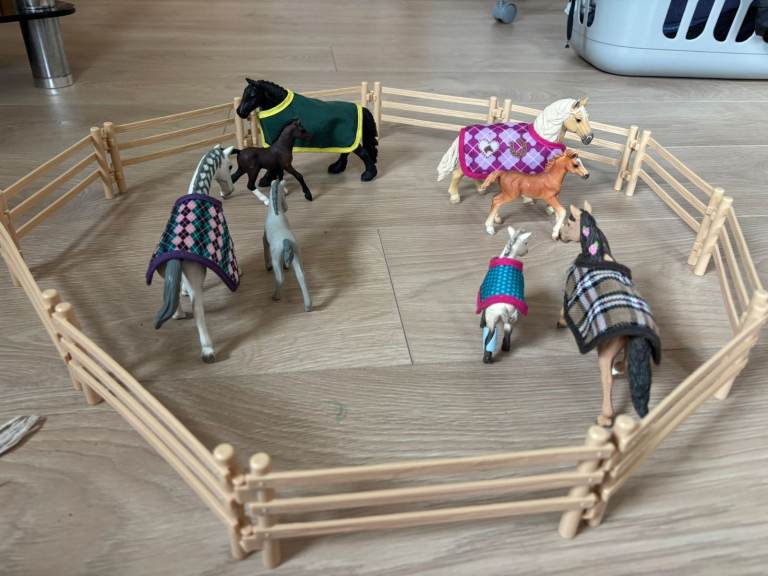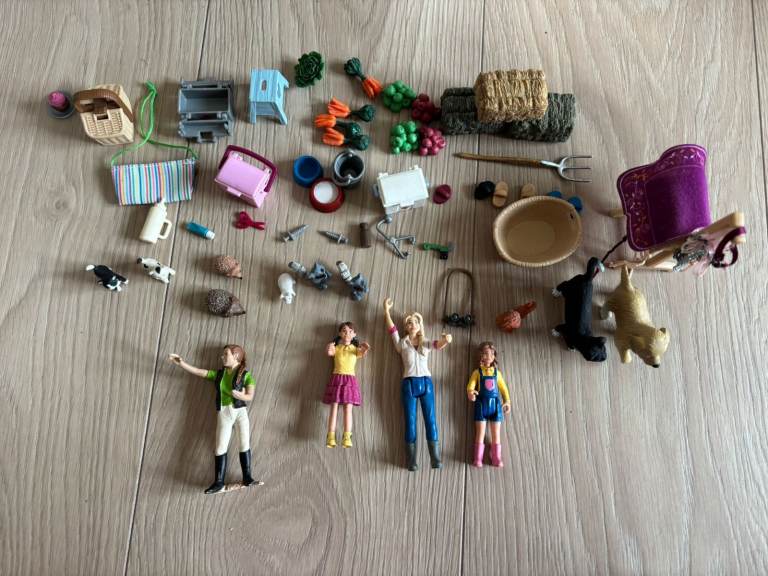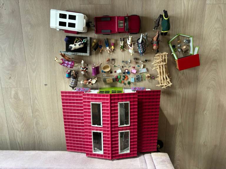 Lovely collection of Schleich horse stable, figures, truck and trailer set.