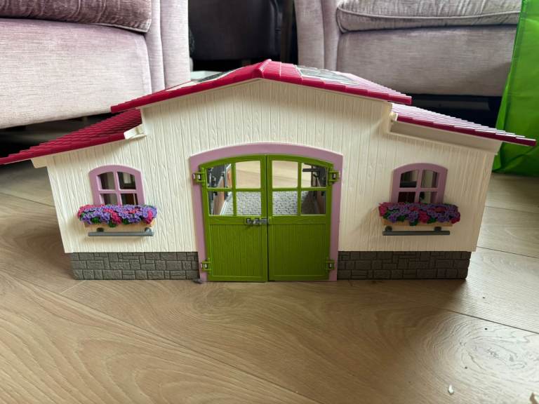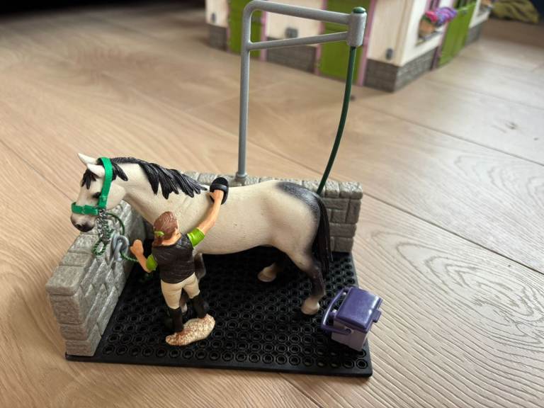 Includes the main stable building, a smaller stable for washing the horses, numerous horse figures, people, and accessories like fencing.
