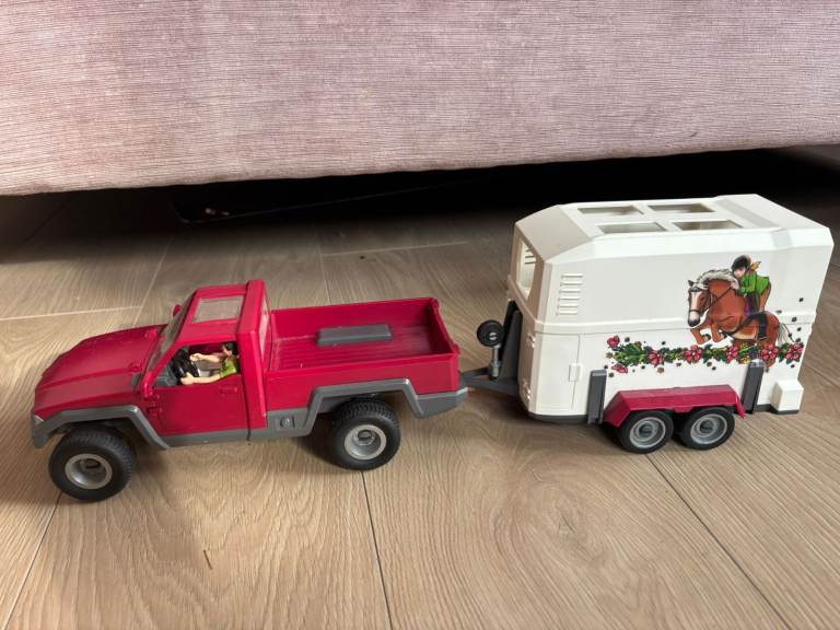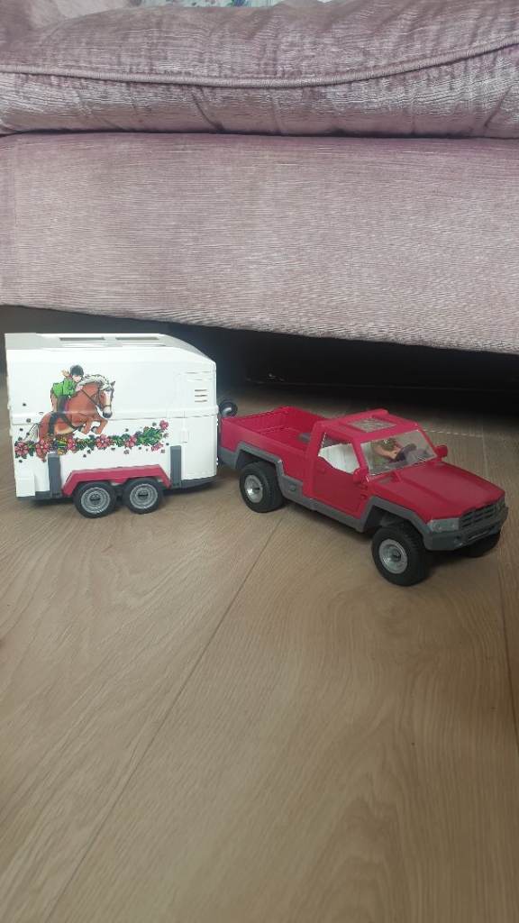 The red pick-up truck and white horse trailer are also part of the set, perfect for transporting the horses.
