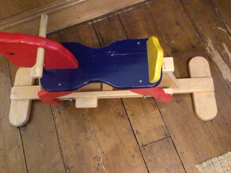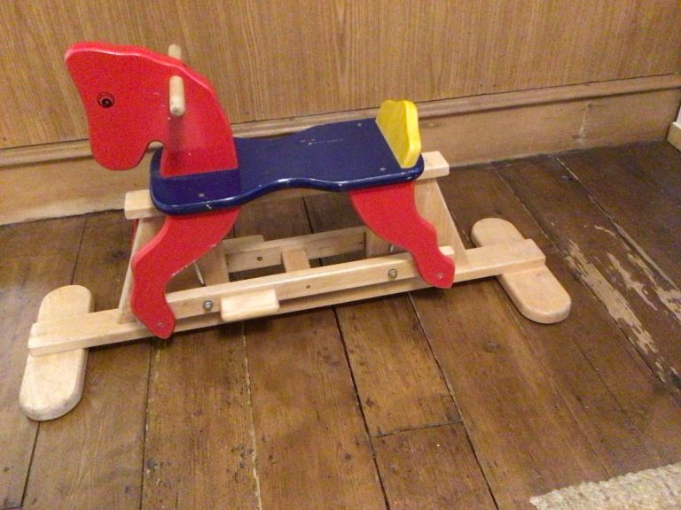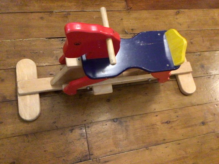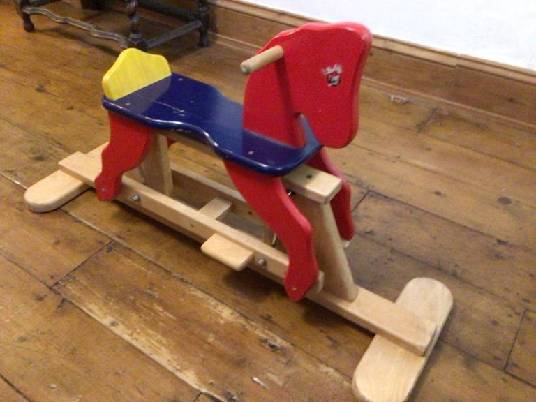 This rocking horse sits on a frame lifting the rocker that slides on its mechanisms making it