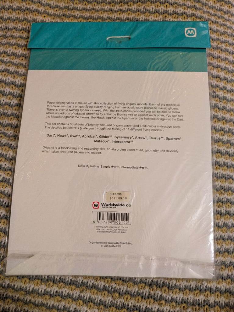 30 sheets of brightly coloured origami paper with a full colour instruction book to make 11 different flying models. Each of the models has a unique flying quality ranging from aerobatic stunt planes to classic gliders