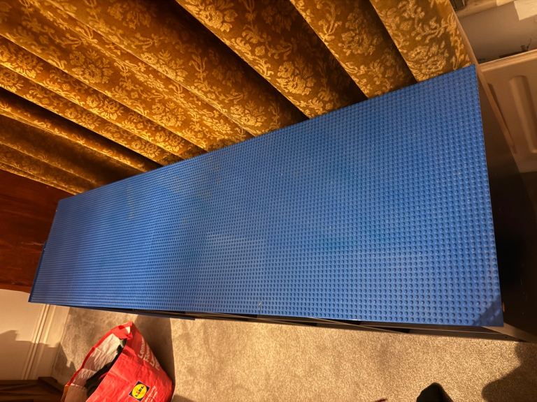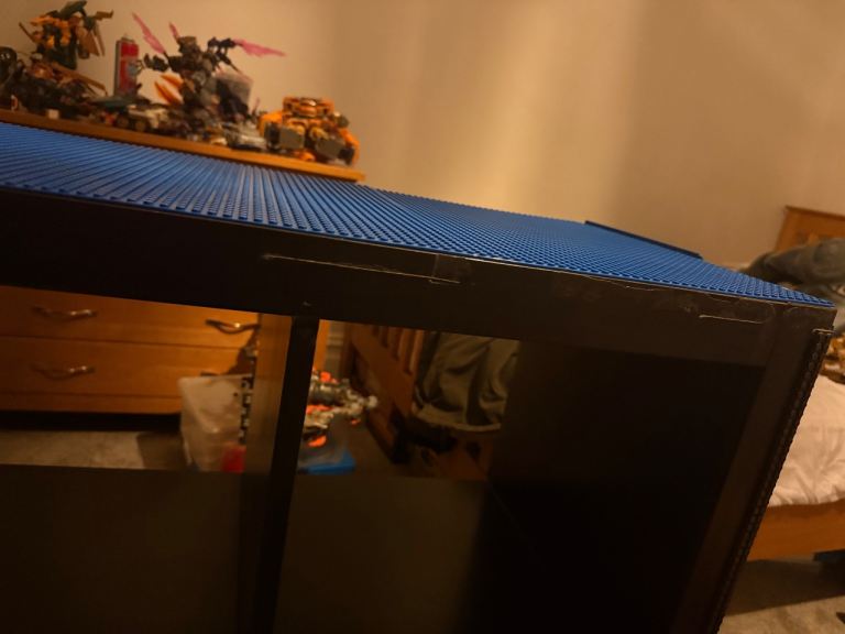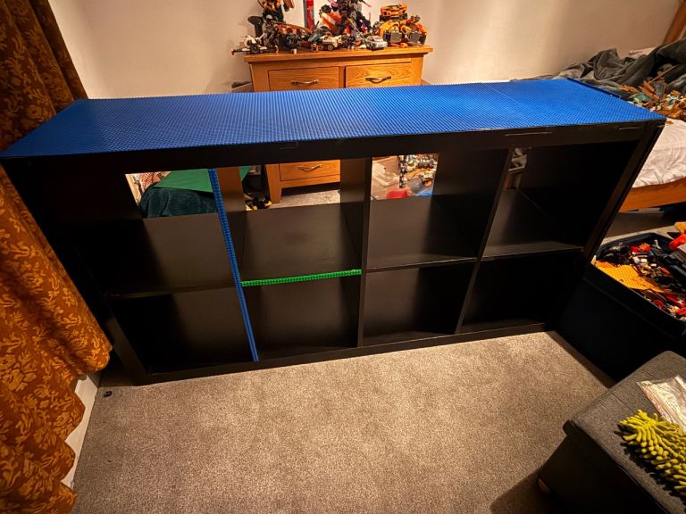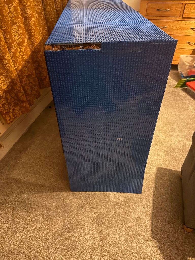 This is a Kallax unit with LEGO base plates stuck on. My kids have grown out of it so it’s looking for a new home. Some of the Lego plates are lifting in places. They could be left as they are or glued down. The top plate on the side snapped during a house move and the bottom one has a crack in the middle. They could be replaced, or pushed against a wall which is what we did. When I made this, I put Lego strips along the frame on one side- most of these did not last but there is some glue residue visible in the pics which doesn’t come off.