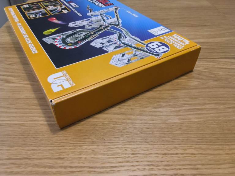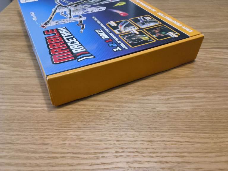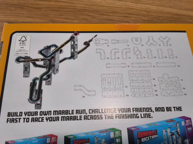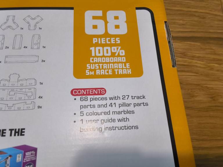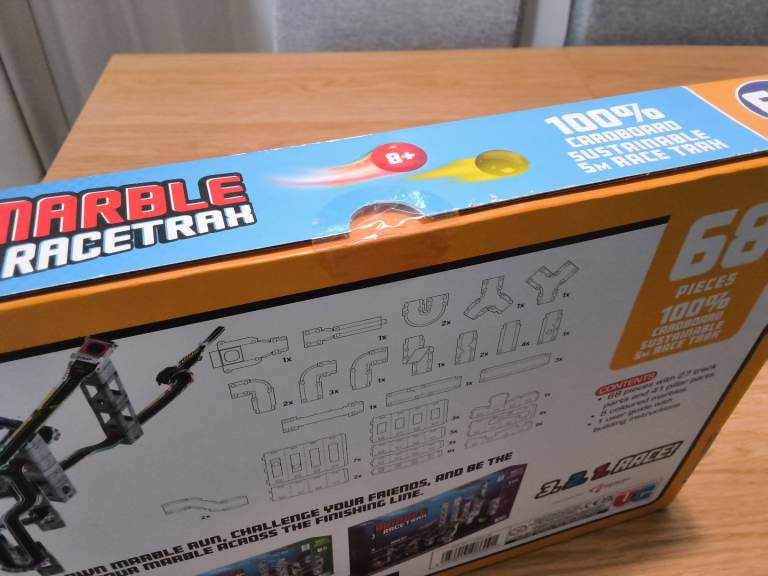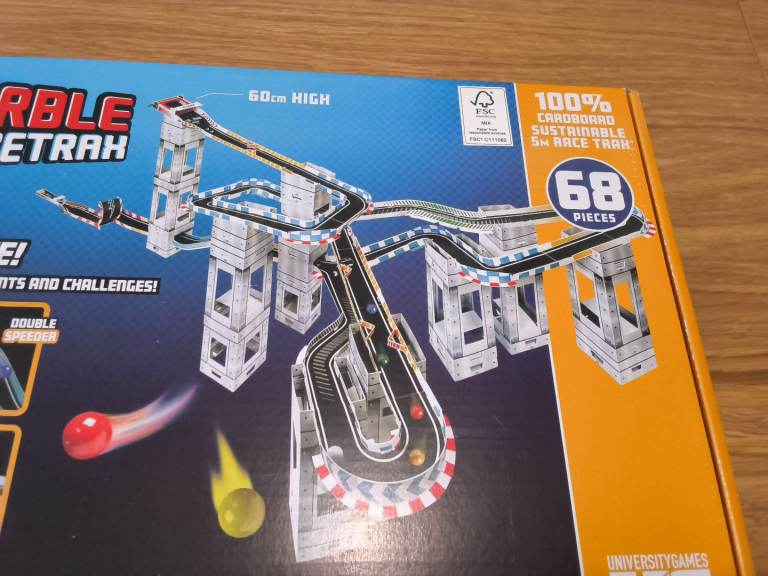Brand new marble racetrax. Box has minor wear from storage. 68 piece cardboard sustainable 5m racetrax with marbles and user guide with building instructions. Collection from Droitwich please. No posting.