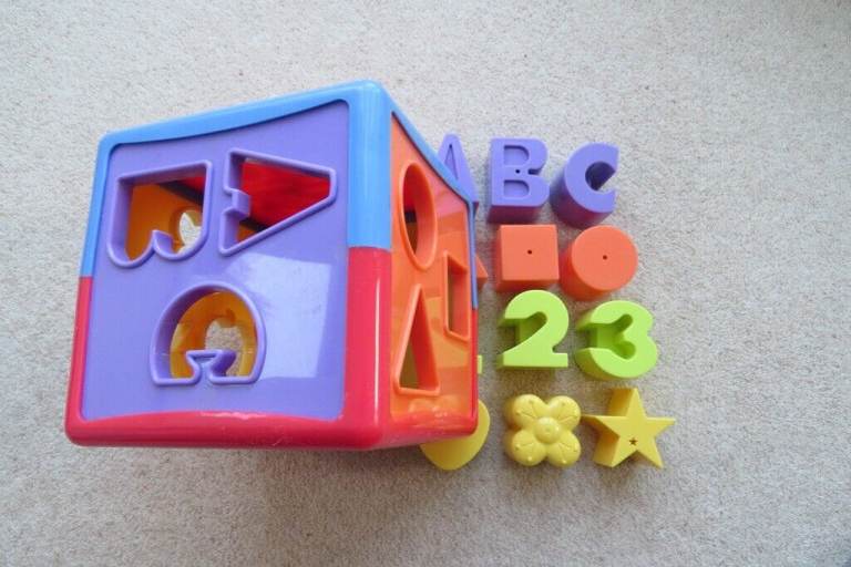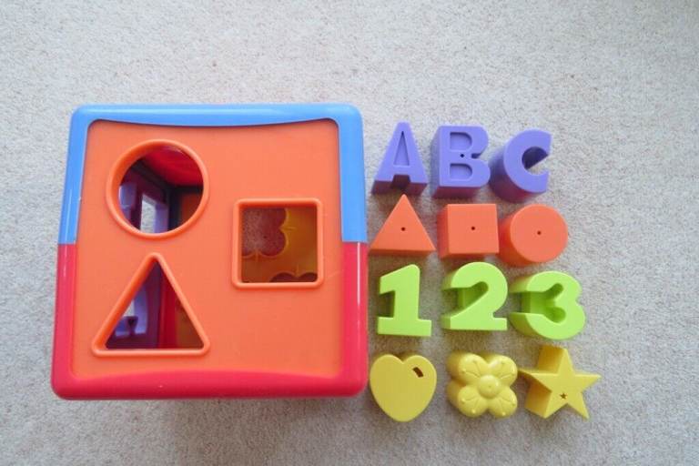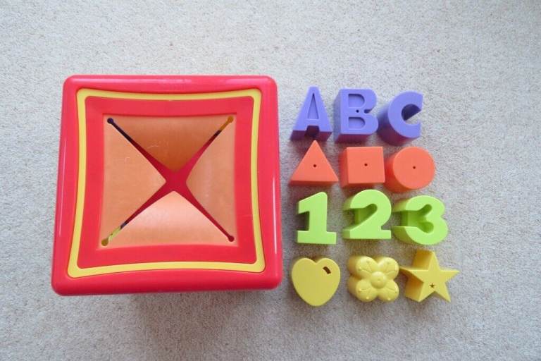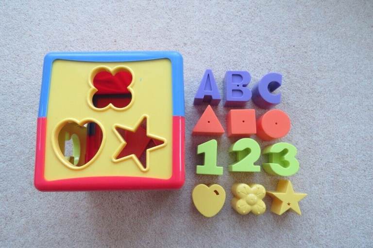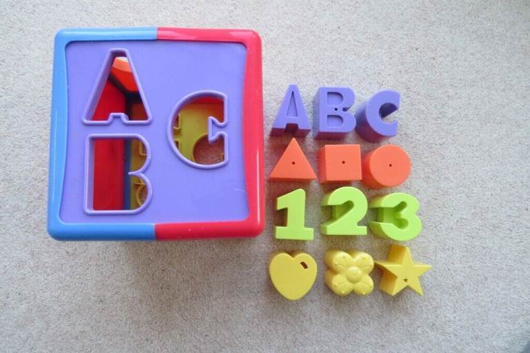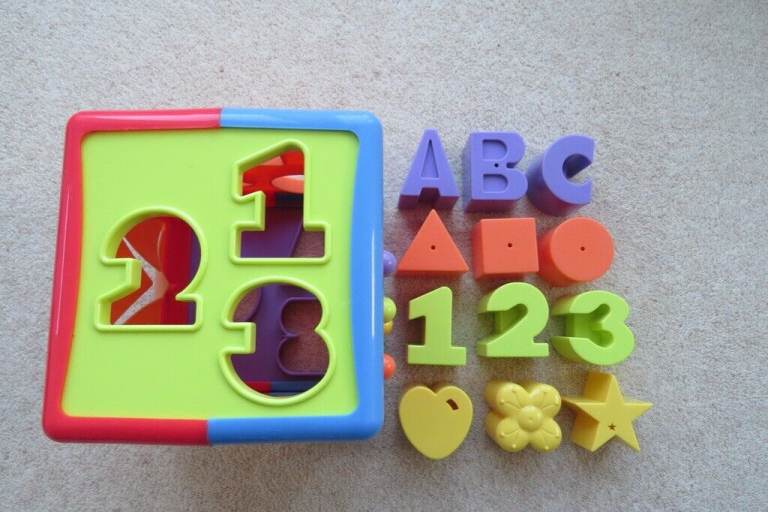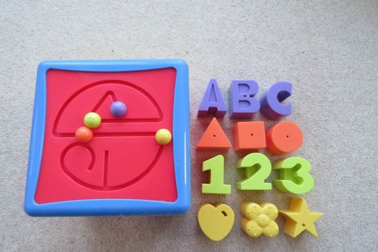 There are 3 numbers, 3 letters and 6 shapes plus a bead maze