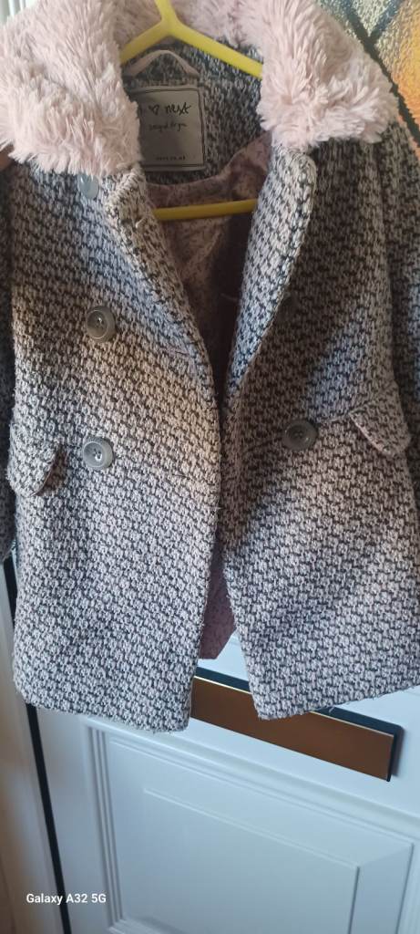 - posh outfit (dress) as well as matching shoes and fluffy jacket