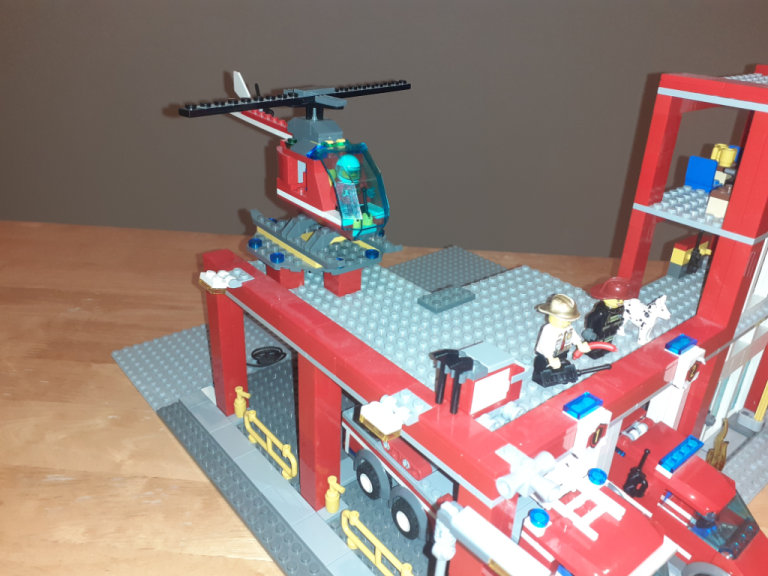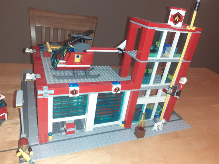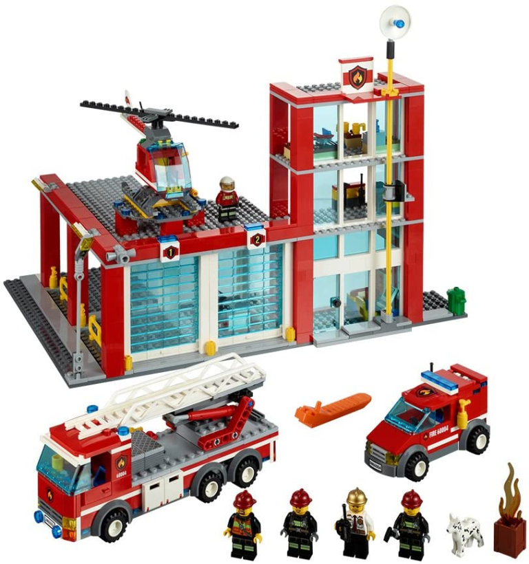 It's a peaceful day in the 3-story LEGO® City Fire Station. The fire chief sips his coffee in his office while a firefighter repairs the truck and another takes a well-earned nap. Spring into action when the alarm bell rings! Slide the firefighters down the pole, load them into the fire truck, van and helicopter to sav⁷e the day in LEGO City! There's tons of fun to be had in this massive building set with 3 vehicles, big, transparent windows and 2 retracting garage doors. Includes 5 minifigures: a fire chief, pilot, and 3 firefighters with assorted accessories.