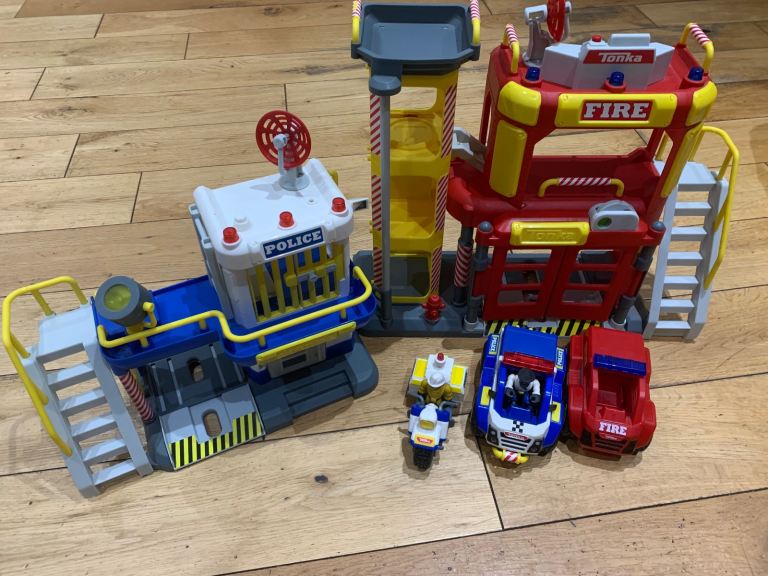 • Features Dalmatian dog, helicopter landing pad, fire pole, 2 retracting garage doors, 3 stories, signage, 2 garage bays, streetlight, trash can, furniture and more