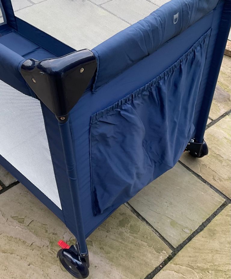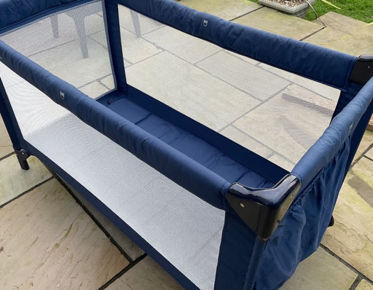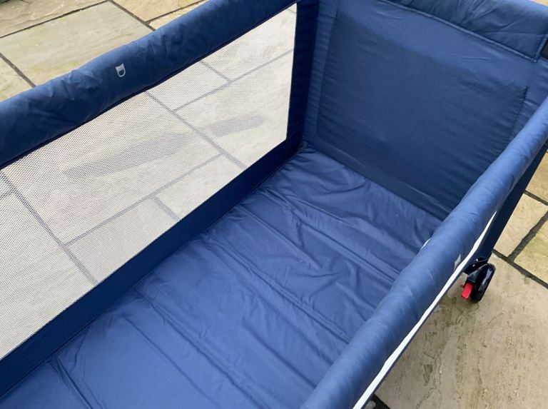 Navy blue baby Dan travel cot. Folds into bag for easy storage. In excellent condition as only used a few times. Has wheels to move around easily. Pick up only or happy to drop off locally.