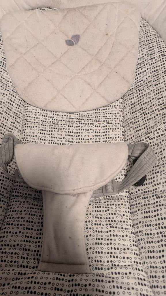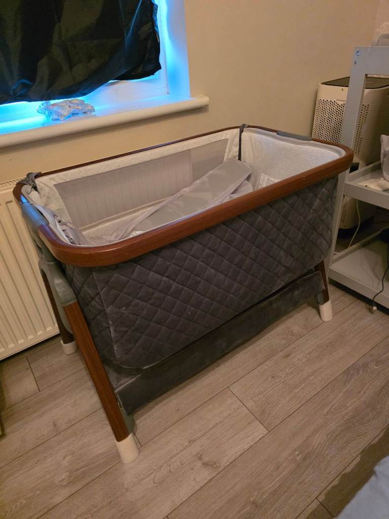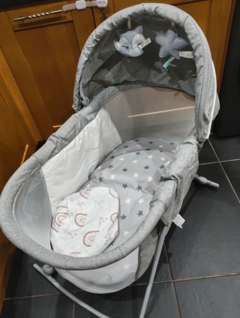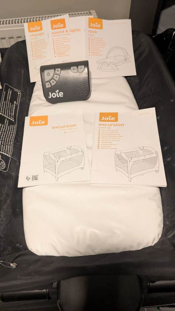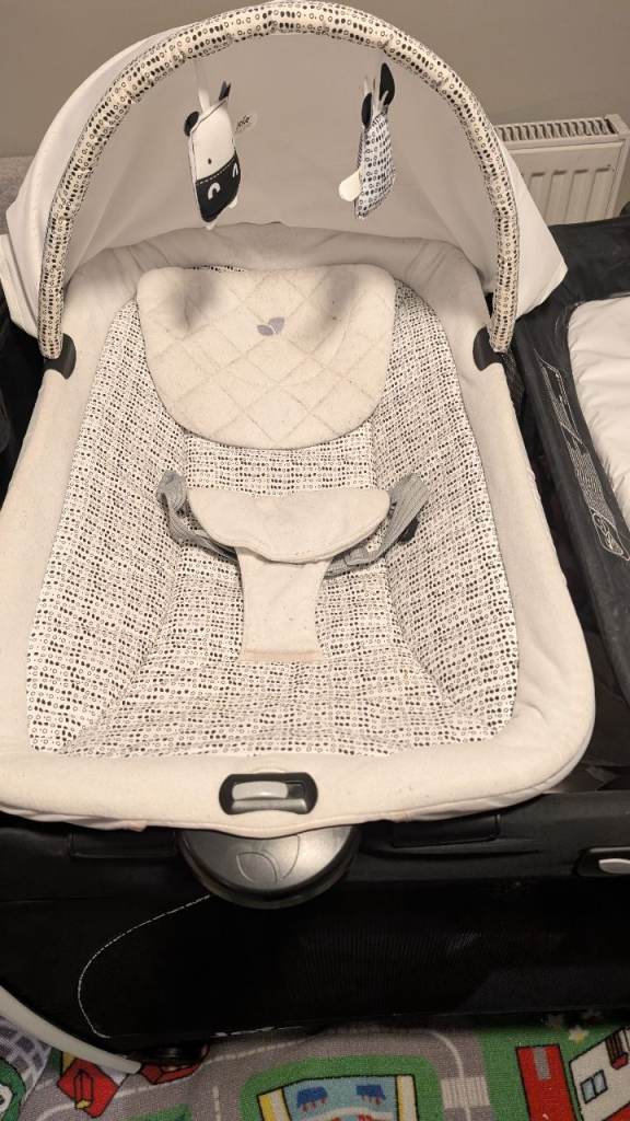 You can use the cot with the changing mat and the rocker chair on or off as they are both free standing and also Clip into the frame if the travel cot. There is what looks like snatch marks on the changing mat but doesn't affect the use of it please see photo. They is some bubbling on the rocker chair but again doesn't affect the use. It comes off to be washed. All information booklets come with it. It has blue tooth system for music but I have never tried it so not sure how it works or if it does to be honest, I can't see why is wouldn't work I just never tried it. The mattress goes to two levels high for newborn and then low as the child gets older . Travel cot goes into a bag for easy traveling, the other two bits you would have to take apart to fit them in the bag. £60 ono