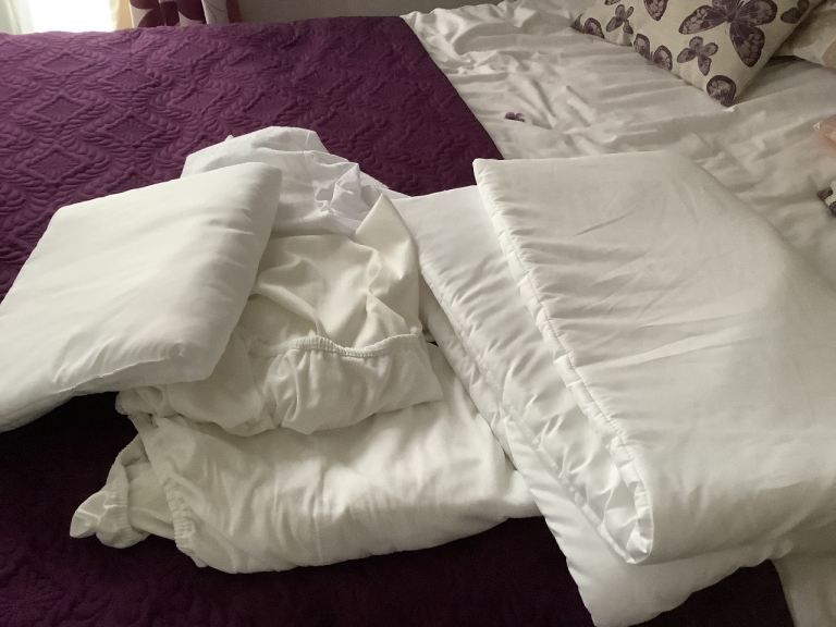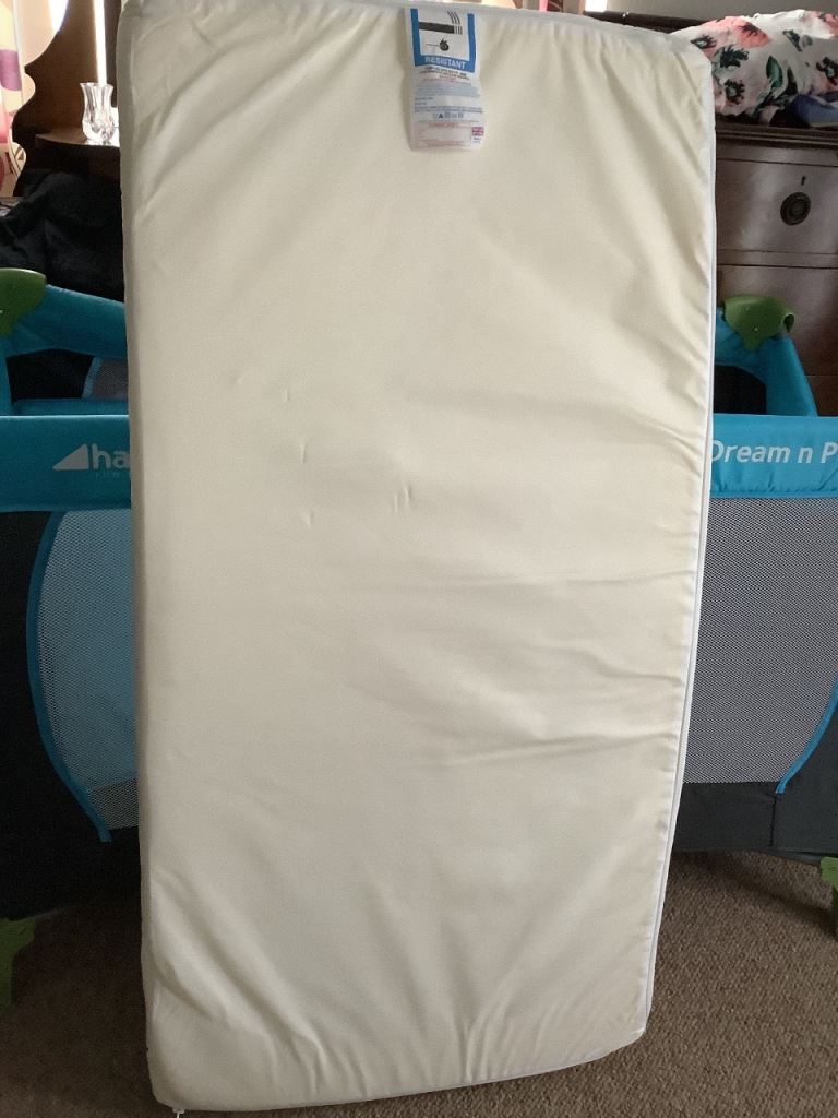 Travel cot large size with new mattress and bedding used twice .