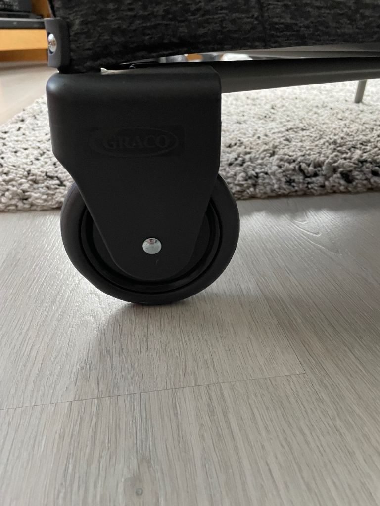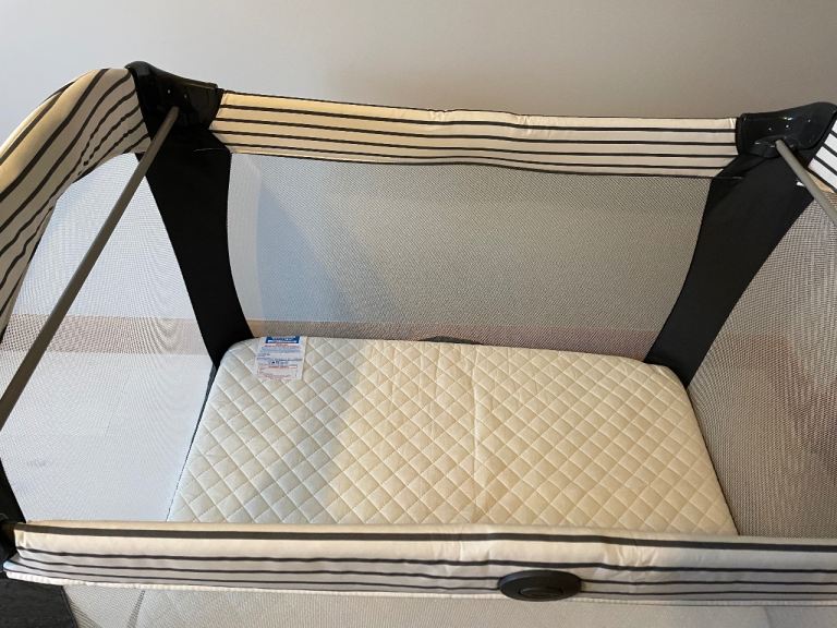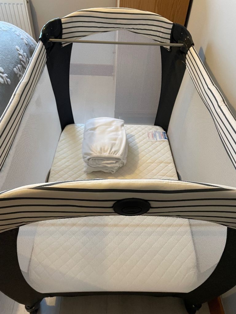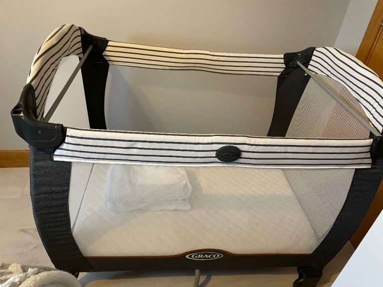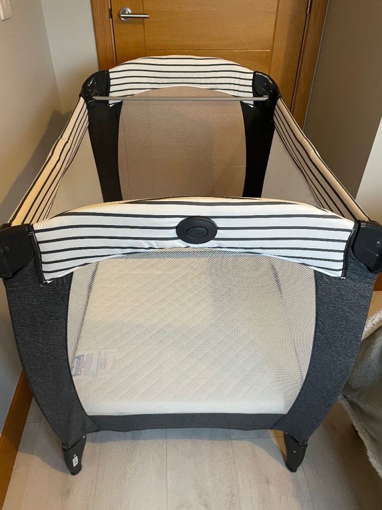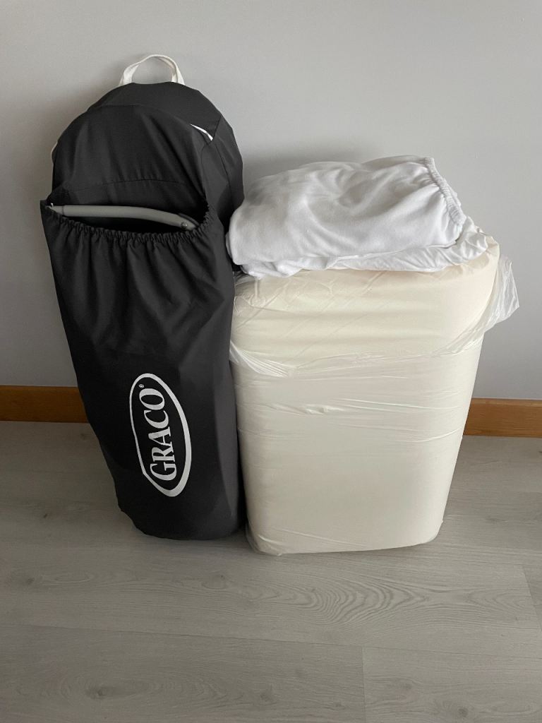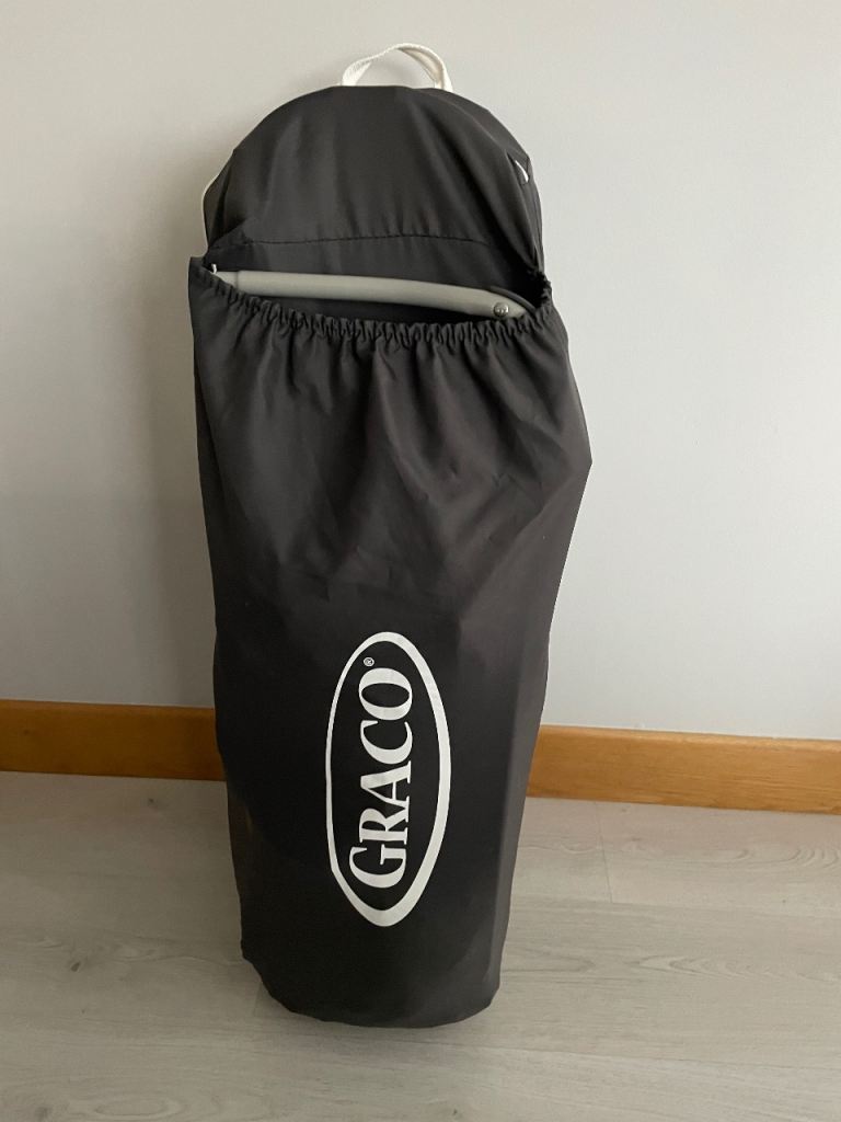 Graco ( bought in mother care)Grey and white travel cot.Immaculate condition.Only used in grandparents house( non smoking)Dismantles into travel bag when needed