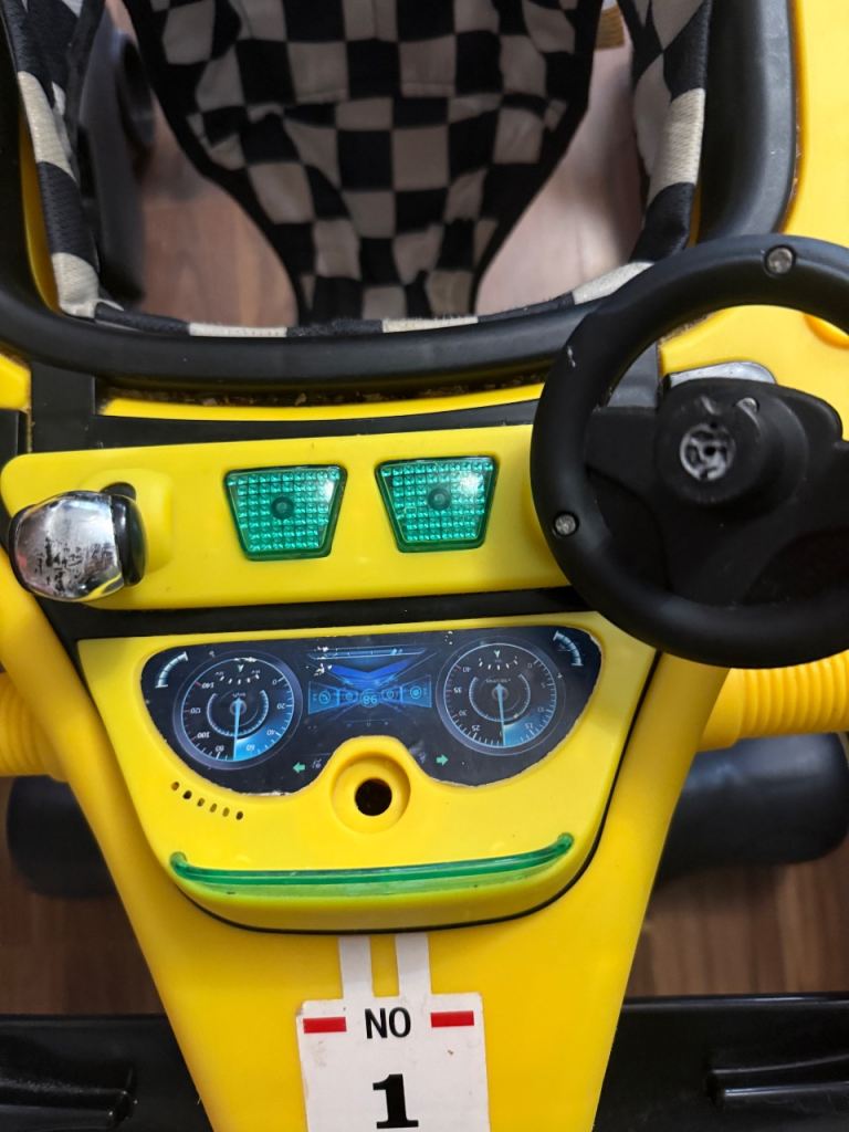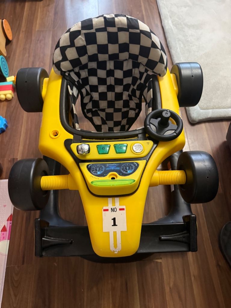 Baby walker with adjust height, car sounds and flashing lights, steering wheel has snapped off but can easily be fixed with strong glue