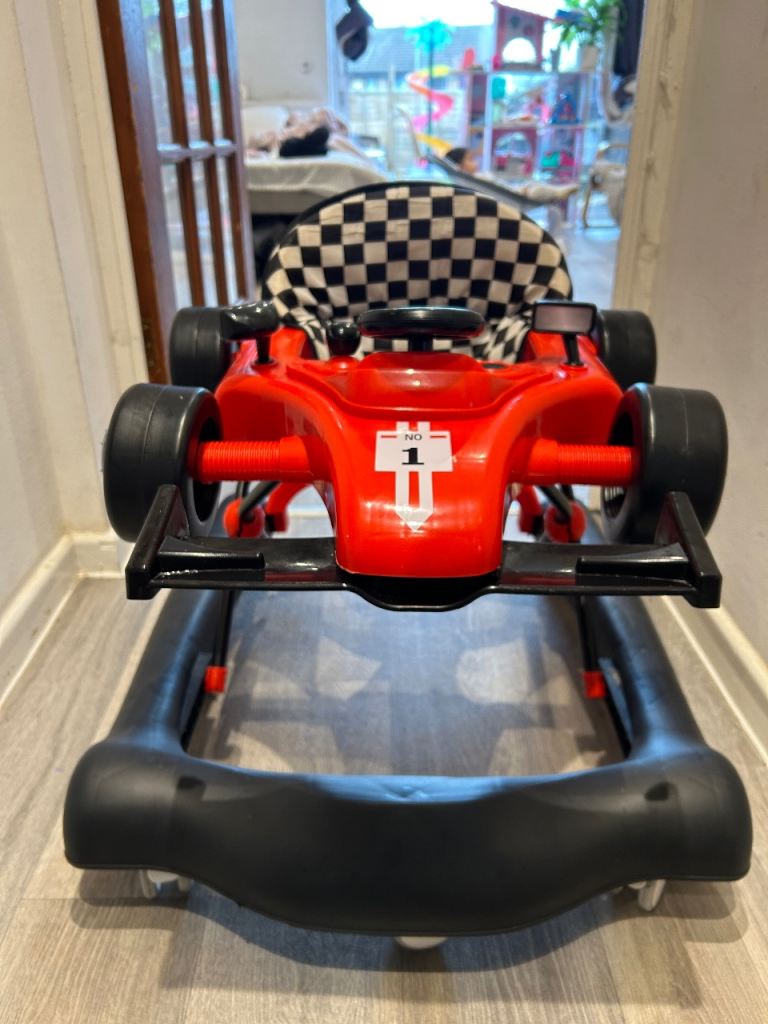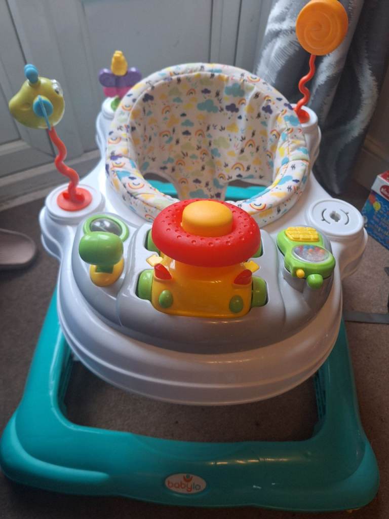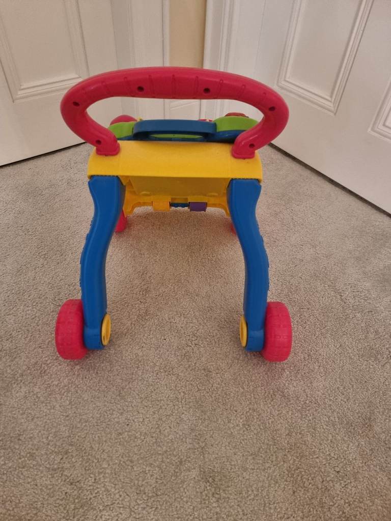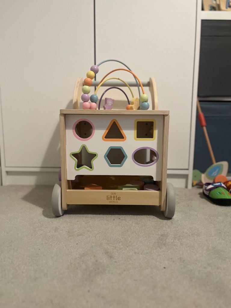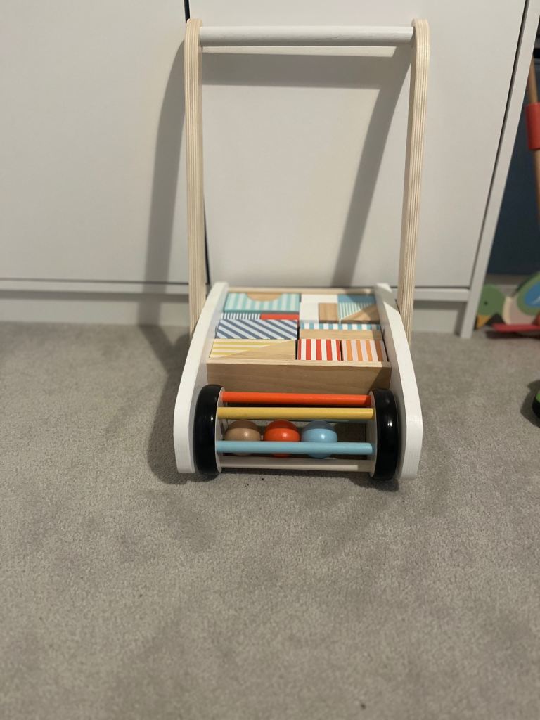Great for young babys to learn to walk by themselves. The blocks work as counterweight and you can also add books.