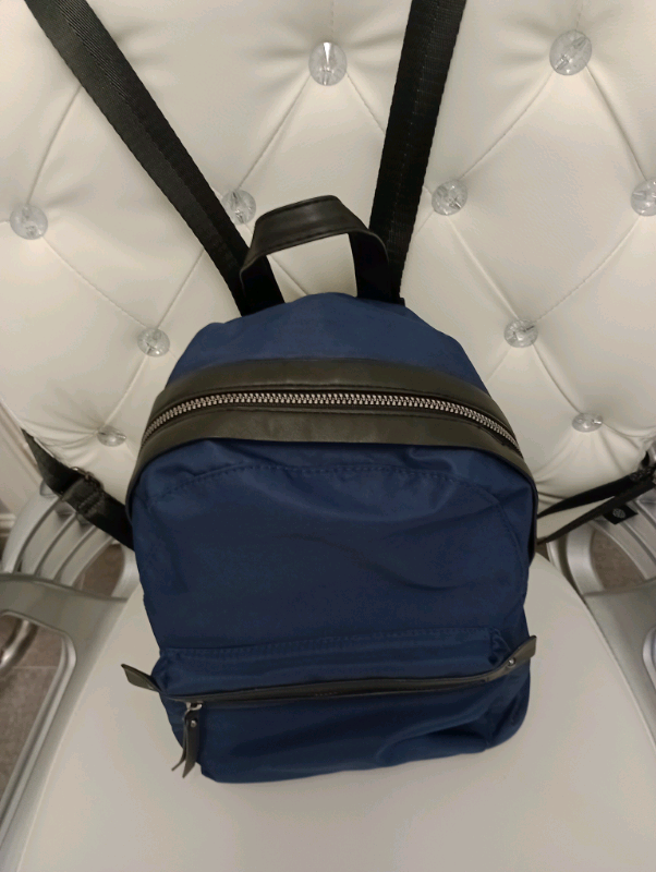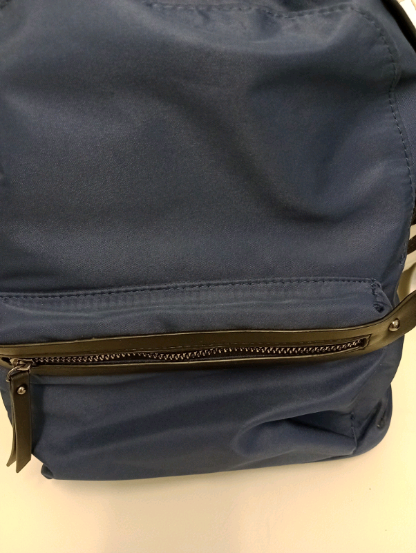 Atmosphere Backpack. Navy/Black. Outside Zipped Pocket. Inside Zipped Pocket.