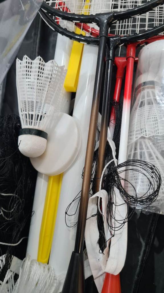 Complete badminton set including rackets and accessories.