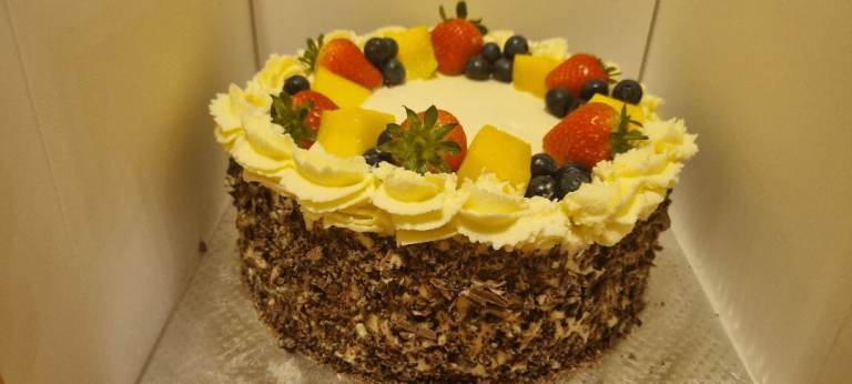 Cakes available for order, also frozen and fried snacks and mini desserts.