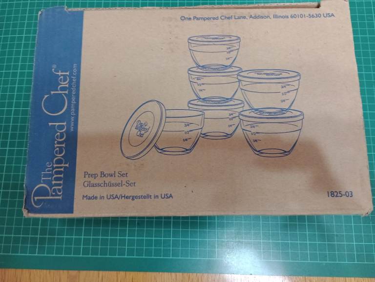 The Pampered Chef Prep Bowl Set, nearly new in its original packaging.