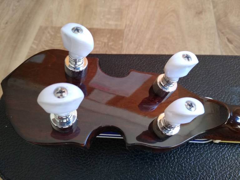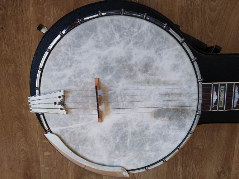 A left-handed Gold Tone wl-250 banjo with the White Ladye tone ring. Open back but suitable for Old Time clawhammer or Bluegrass picking. A bright sound that really cuts through. Excellent low action. Fitted with a Shubb sliding 5th string capo. Attractive cloud inlays and in excellent condition. Current cost new £899. Check out the Gold Tone website for details and to hear one played. With original Gold Tone hard case.