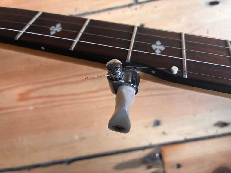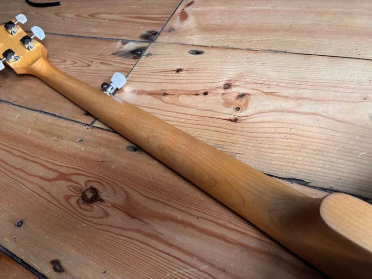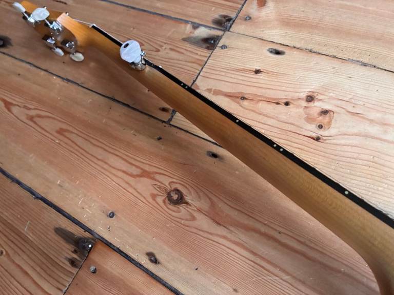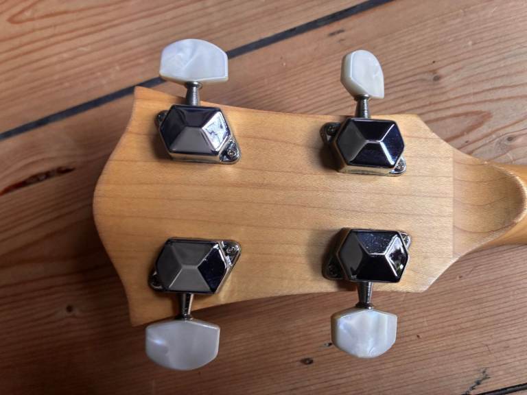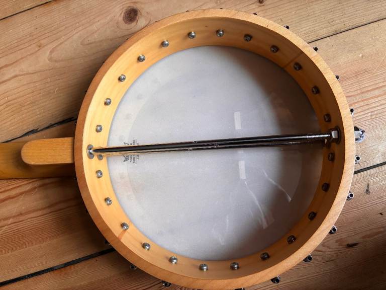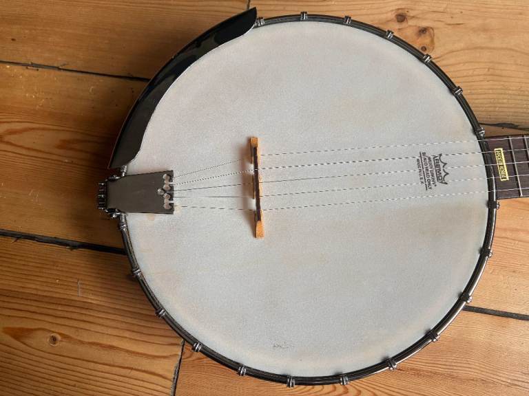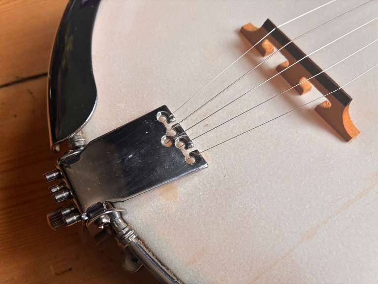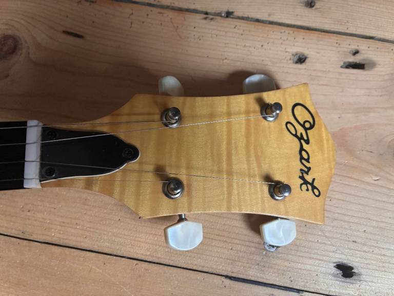 Its just been restrung with D'addario 5 string banjo strings. It plays well and sounds good. Tuned G D G BG but the strings will be loosened for shipping.