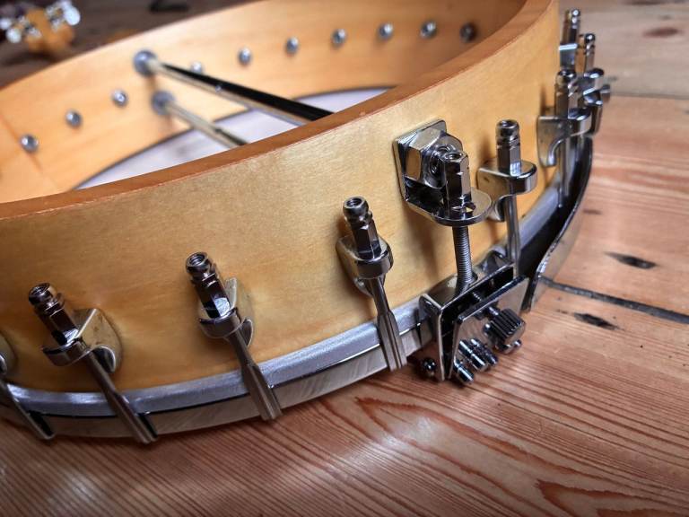 It features a Maple shell with armrest, Ovangkol fretboard with banjo diamond fretboard markers and chrome geared tuners.