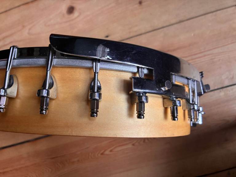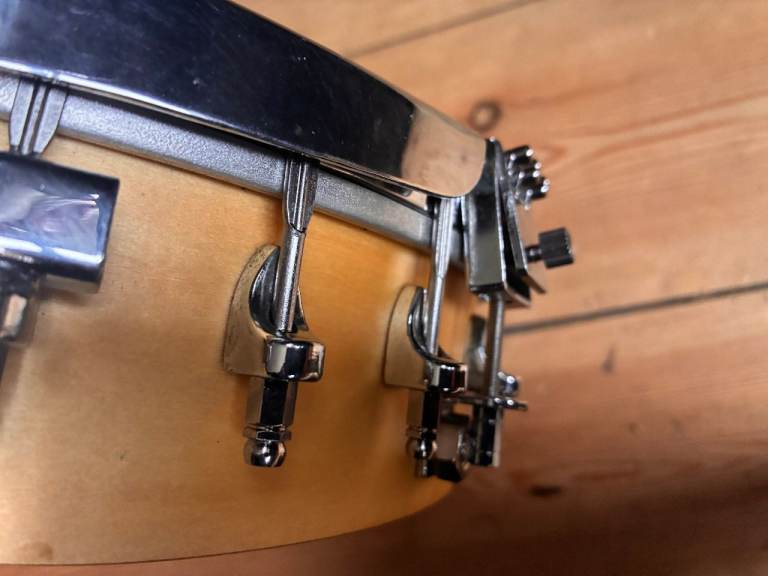 Pre owned , used and generally good condition, light marks and signs of pre ownership some tarnishing and light staining to the Remo head, light tarnishing to the metal parts. A couple of small marks to the body in places.