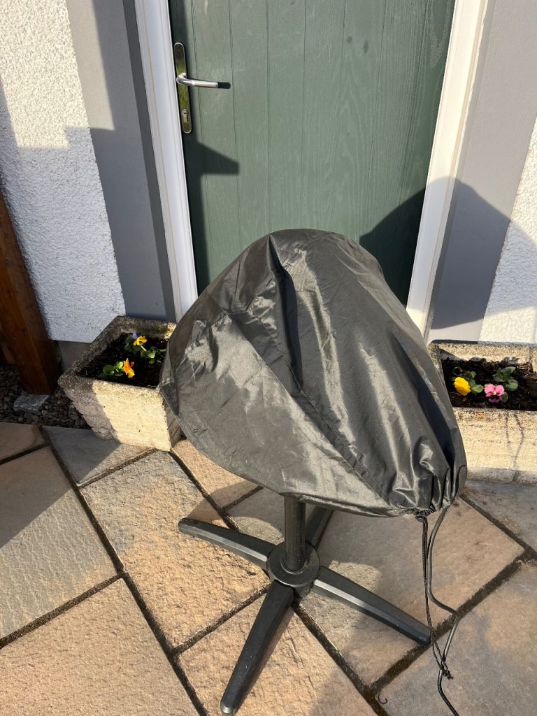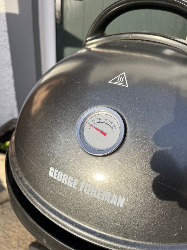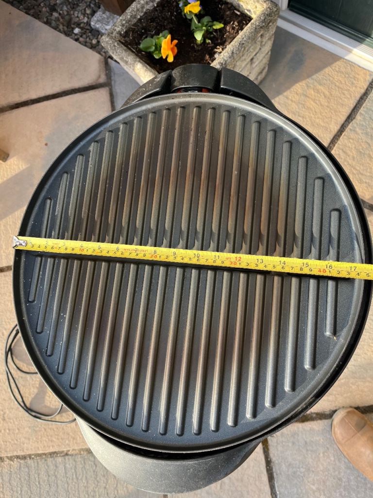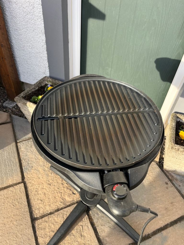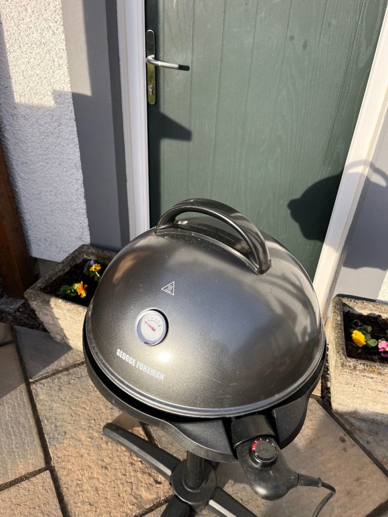George Foreman Electric BBQ. Can be used on a table or on its own stand. Comes with a rain cover. In good used condition. Can deliver locally